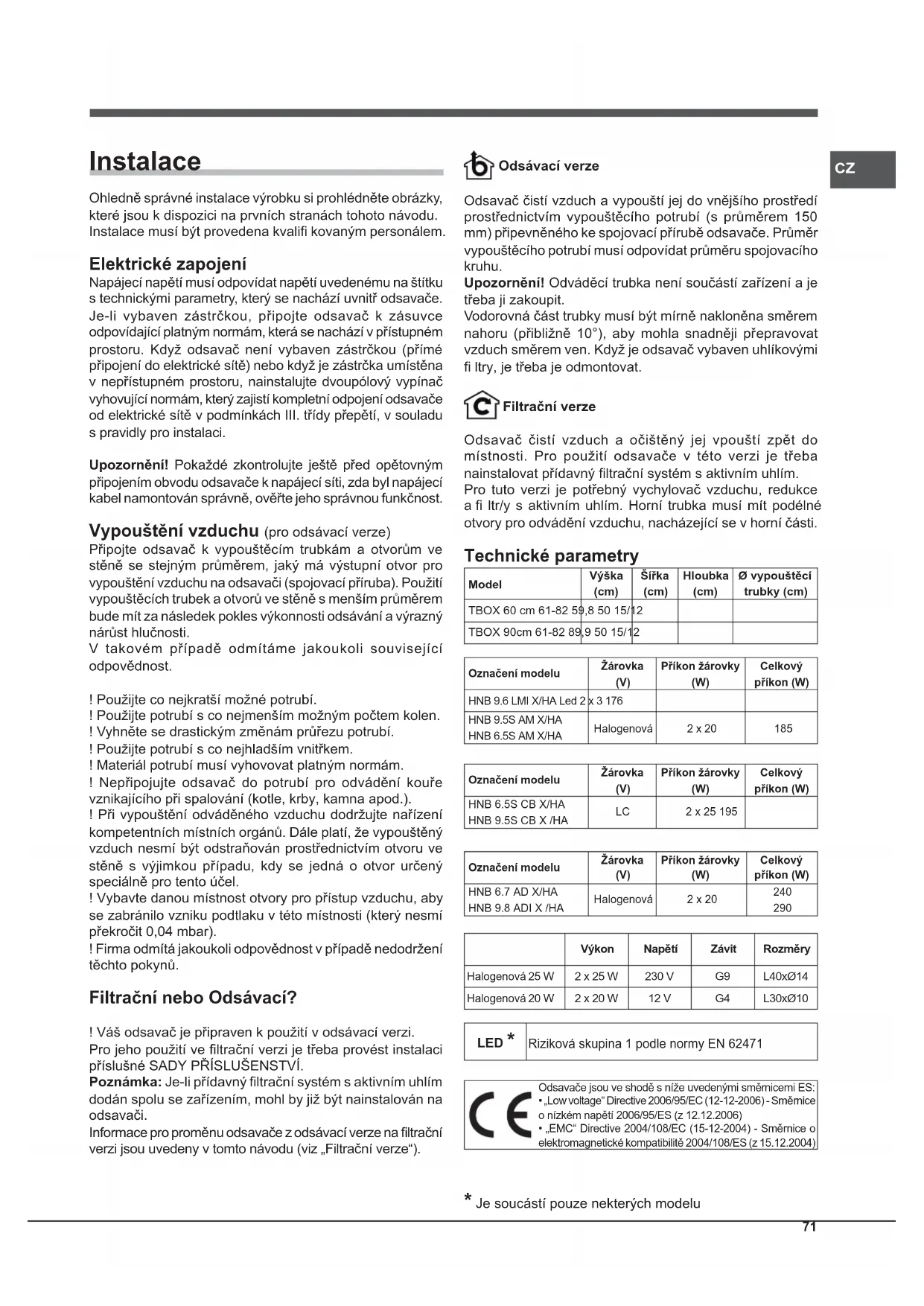 Instalace Ohledně správné instalace výrobku si prohlédněte obrázky, které jsou k dispozici na prvních stranách tohoto návodu. Instalace musí být provedena kvalifi kovaným personálem. Elektrické zapojení Napájecí napětí musí odpovídat napětí uvedenému na štítku s technickými parametry, který se nachází uvnitř odsavače. Je-li vybaven zástrčkou, připojte odsavač k zásuvce odpovídající platným normám, která se nachází v přístupném prostoru. Když odsavač není vybaven zástrčkou (přímé připojení do elektrické sítě) nebo když je zástrčka umístěna v nepřístupném prostoru, nainstalujte dvoupólový vypínač vyhovující normám, který zajistí kompletní odpojení odsavače od elektrické sítě v podmínkách III. třídy přepětí, v souladu s pravidly pro instalaci. Upozornění! Pokaždé zkontrolujte ještě před opětovným připojením obvodu odsavače k napájecí síti, zda byl napájecí kabel namontován správně, ověřte jeho správnou funkčnost. Vypouštění vzduchu (pro odsávací verze) Připojte odsavač k vypouštěcím trubkám a otvorům ve stěně se stejným průměrem, jaký má výstupní otvor pro vypouštění vzduchu na odsavači (spojovací příruba). Použití vypouštěcích trubek a otvorů ve stěně s menším průměrem bude mít za následek pokles výkonnosti odsávání a výrazný nárůst hlučnosti. V takovém případě odmítáme jakoukoli související odpovědnost. ! Použijte co nejkratší možné potrubí. ! Použijte potrubí s co nejmenším možným počtem kolen. ! Vyhněte se drastickým změnám průřezu potrubí. ! Použijte potrubí s co nejhladším vnitřkem. ! Materiál potrubí musí vyhovovat platným normám. ! Nepřipojujte odsavač do potrubí pro odvádění kouře vznikajícího při spalování (kotle, krby, kamna apod.). ! Při vypouštění odváděného vzduchu dodržujte nařízení kompetentních místních orgánů. Dále platí, že vypouštěný vzduch nesmí být odstraňován prostřednictvím otvoru ve stěně s výjimkou případu, kdy se jedná o otvor určený speciálně pro tento účel. ! Vybavte danou místnost otvory pro přístup vzduchu, aby se zabránilo vzniku podtlaku v této místnosti (který nesmí překročit 0,04 mbar). ! Firma odmítá jakoukoli odpovědnost v případě nedodržení těchto pokynů. Filtrační nebo Odsávací? ! Váš odsavač je připraven k použití v odsávací verzi. Pro jeho použití ve fi ltrační verzi je třeba provést instalaci příslušné SADY PŘÍSLUŠENSTVÍ. Poznámka: Je-li přídavný fi ltrační systém s aktivním uhlím dodán spolu se zařízením, mohl by již být nainstalován na odsavači. Informace pro proměnu odsavače z odsávací verze na fi ltrační verzi jsou uvedeny v tomto návodu (viz „Filtrační verze“). Odsávací verze Odsavač čistí vzduch a vypouští jej do vnějšího prostředí prostřednictvím vypouštěcího potrubí (s průměrem 150 mm) připevněného ke spojovací přírubě odsavače. Průměr vypouštěcího potrubí musí odpovídat průměru spojovacího kruhu. Upozornění! Odváděcí trubka není součástí zařízení a je třeba ji zakoupit. Vodorovná část trubky musí být mírně nakloněna směrem nahoru (přibližně 10°), aby mohla snadněji přepravovat vzduch směrem ven. Když je odsavač vybaven uhlíkovými fi ltry, je třeba je odmontovat. Filtrační verze Odsavač čistí vzduch a očištěný jej vpouští zpět do místnosti. Pro použití odsavače v této verzi je třeba nainstalovat přídavný fi ltrační systém s aktivním uhlím. Pro tuto verzi je potřebný vychylovač vzduchu, redukce a fi ltr/y s aktivním uhlím. Horní trubka musí mít podélné otvory pro odvádění vzduchu, nacházející se v horní části. Technické parametry ModelVýška (cm) Šířka (cm) Hloubka (cm) Ø vypouštěcí trubky (cm)TBOX 60 cm 61-82 59,8 50 15/12TBOX 90cm 61-82 89,9 50 15/12Označení modeluŽárovka (V) Příkon žárovky (W) Celkový příkon (W)HNB 9.6 LMI X/HA Led 2 x 3 176HNB 9.5S AM X/HAHNB 6.5S AM X/HAHalogenová 2 x 20 185Označení modeluŽárovka (V) Příkon žárovky (W) Celkový příkon (W)HNB 6.5S CB X/HAHNB 9.5S CB X /HALC 2 x 25 195Označení modeluŽárovka (V) Příkon žárovky (W) Celkový příkon (W)HNB 6.7 AD X/HAHNB 9.8 ADI X /HAHalogenová 2 x 20