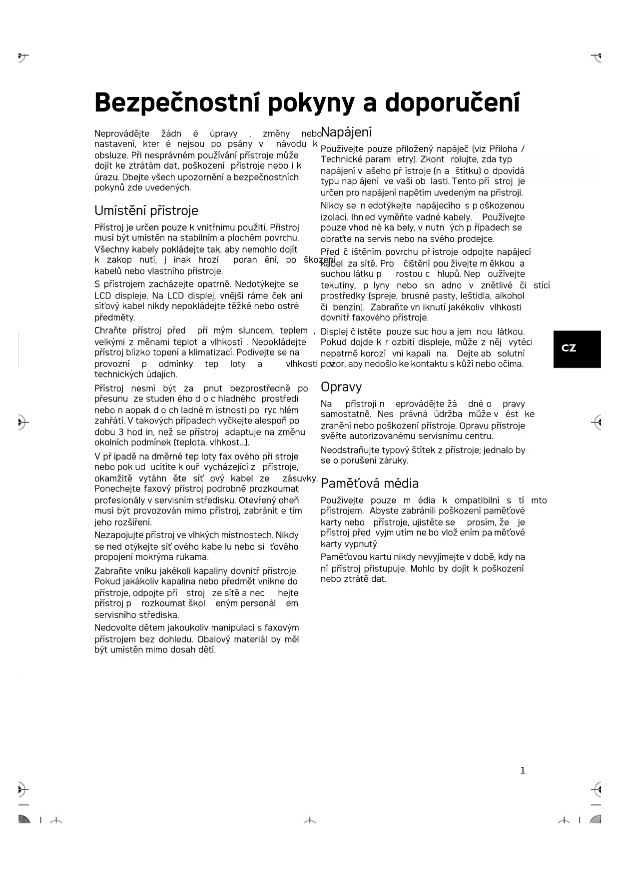 Před č ištením povrchu přístroje odpojte napájecí zení kabel za sitě. Pro čištění pou živejte měkkou a suchou látku p rostou c hlupů. Nep ouživejte tekutiny, p lyny nebo sn adno v znětlivé či stící prostředky (spreje, brusné pasty, leštidla, alkohol či benzín). Zabraňte vn iknutí jakékoliv vlhkosti dovnitř faxového přístroje.