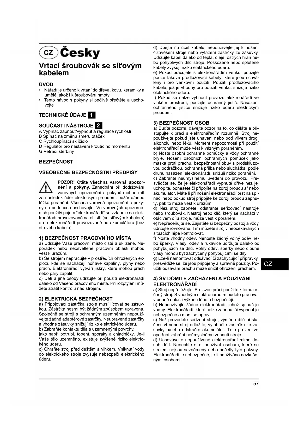 ELEKTRONÁŘADÍ a) Stroj nepřetěžujte. Pro svou práci použijte k tomu ur- čený stroj. S vhodným elektronářadím budete pracovat v udané oblasti výkonu lépe a bezpečněji. b) Nepoužívejte žádné elektronářadí, jehož spínač je vadný. Elektronářadí, které nelze zapnout či vypnout je nebezpečné a musí se opravit. c) Než provedete seřízení stroje, výměnu dílů příslu- šenství nebo stroj odložíte, vytáhněte zástrčku ze zá- suvky a/nebo odstraňte akumulátor. Toto preventivní opatření zabrání neúmyslnému zapnutí stroje. d) Uchovávejte nepoužívané elektronářadí mimo do- sah dětí. Nenechte stroj používat osobám, které se strojem nejsou seznámeny nebo nečetly tyto pokyny. Elektronářadí je nebezpečné, je-li používáno nezkuše- nými osobami. Vrtací šroubovák se síťovým kabelem ÚVOD
