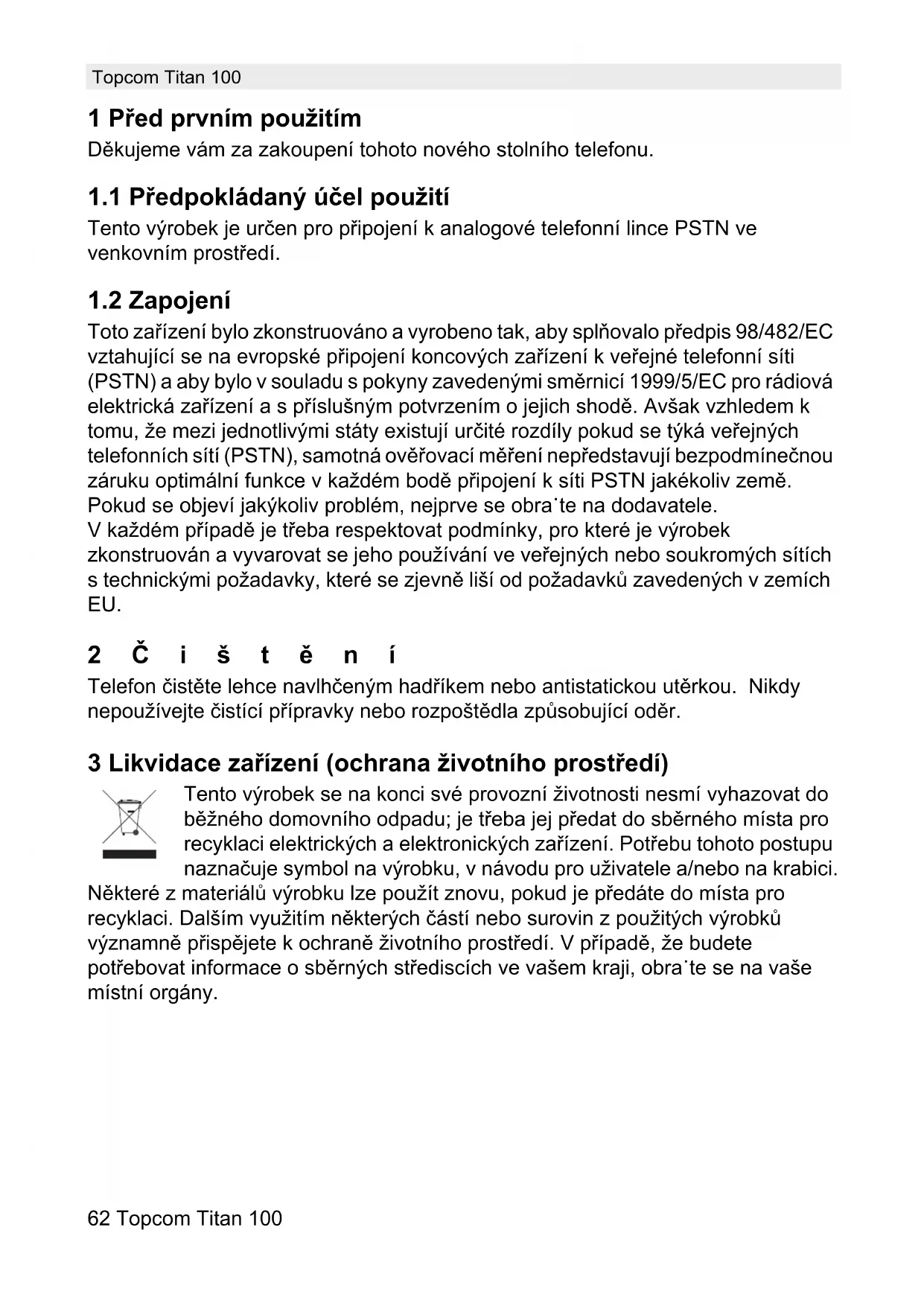 , “”.62 Topcom Titan 100 Topcom Titan 100 1 Ped prvním použitím Dªkujeme vám za zakoupení tohoto nového stolního telefonu.