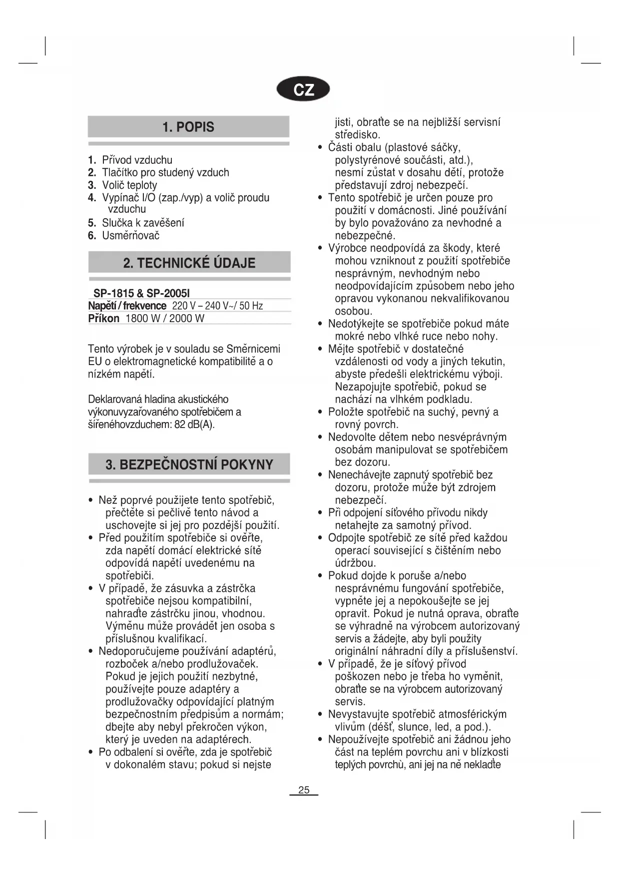 Tento výrobek je v souladu se Směrnicemi EU o elektromagnetické kompatibilitě a o nízkém napětí. Deklarovaná hladina akustického výkonuvyzařovaného spotřebičem a šířenéhovzduchem: 82 dB(A). SP-1815 & SP-2005I Napětí / frekvence 220 V – 240 V~/ 50 Hz Příkon 1800 W / 2000 W26 (plynové nebo elektrické hořáky, nebo trouby).
