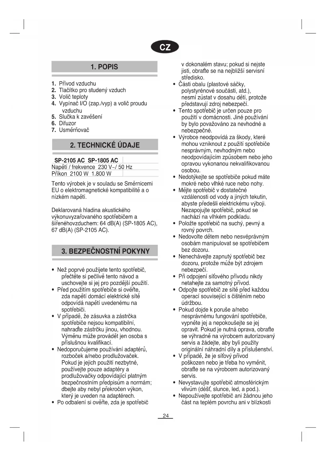 Tento výrobek je v souladu se Směrnicemi EU o elektromagnetické kompatibilitě a o nízkém napětí. Deklarovaná hladina akustického výkonuvyzařovaného spotřebičem a šířenéhovzduchem: 64 dB(A) (SP-1805 AC), 67 dB(A) (SP-2105 AC). SP-2105 AC SP-1805 AC Napětí / frekvence 230 V~/ 50 Hz Příkon 2100 W 1.800 W25 teplých povrchù, ani jej na ně neklaďte (plynové nebo elektrické hořáky, nebo trouby).