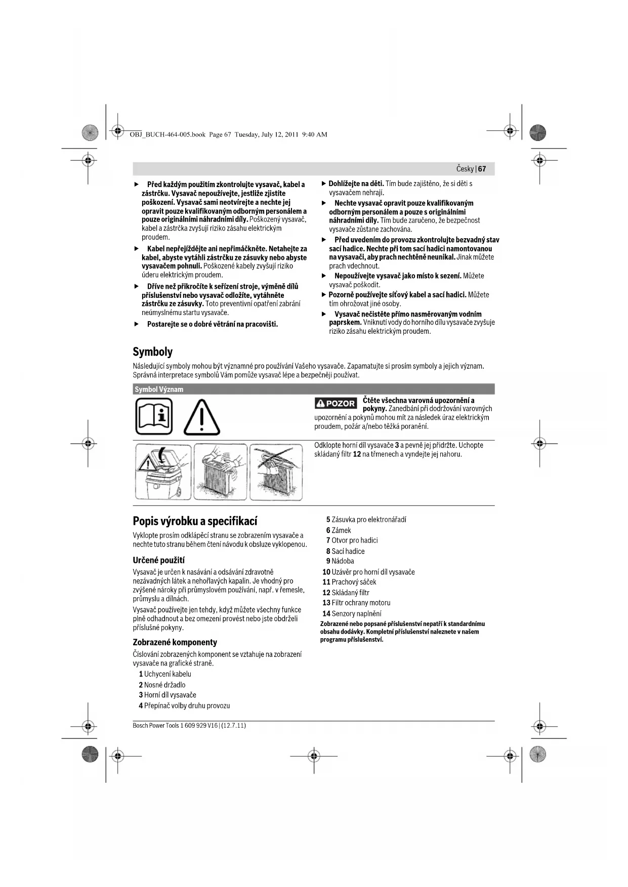 POZOR POZOR OBJ_BUCH-464-005.book Page 66 Tuesday, July 12, 2011 9:40 AMČesky | 67 Bosch Power Tools 1 609 929 V16 | (12.7.11) f Před každým použitím zkontrolujte vysavač, kabel a