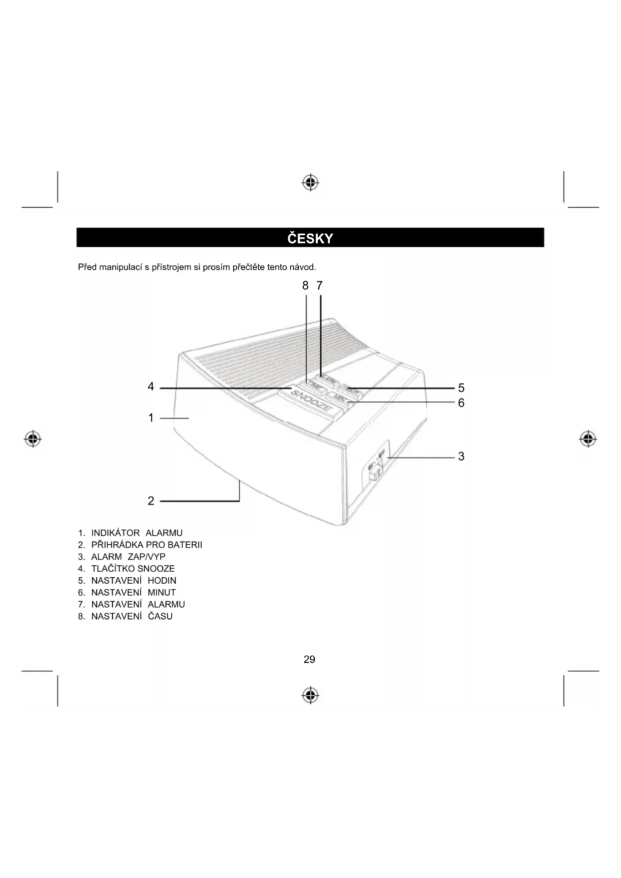 Posuňte tlačítko ALARM ON/OFF (3) do polohy “ON”. INDIKÁTOR ALARMU (1) se rozsvítí a alarm se rozezní v přednastavený čas. Pro ztišení alarmu posuňte tlačítko ALARM ON/OFF (3) do polohy “OFF” pro vypnutí alarmu. Pro vyresetování alarmu pro následující den posuňte tlačítko ALARM ON/OFF (3) znovu do polohy “ON”. SNOOZE Když zazní alarm, jednoduše stiskněte TLAČÍTKO SNOOZE (4) pro dočasné odložení alarmu. Alarm se rozezní znovu o 9 minut později. Alarm lze libovolně odkládat po dobu až dvou hodin. ZÁLOŽNÍ BATERIE (baterie není součástí dodávky) V případě výpadku napájení se přístroj automaticky přepne do pohotovostního režimu napájeného baterií, je-li tato nainstalována. Otevřete PŘIHRÁDKU PRO BATERII na spodní straně přístroje a vložte 9 V baterii. V bateriovém provozu nadále poběží čas a alarm se rozezní v přednastavenou dobu. Pouze displej hodin nebude svítit kvůli úspoře energie baterie. Je-li výpadek napájení dlouhodobý, může být po jeho obnovení potřeba čas hodin lehce upravit. Hodiny používají vnitřní obvod hodin napájený baterií, který je méně přesný než síťový kmitočet. Čas alarmu zůstane správný. SPECIFIKACE Zdroj napájení: 230 V ~ 50 Hz Baterie DC: 9 V (1 x 9 V 6F22 / 6LR61 není součástí dodávky) Spotřeba energie: 2 W31 Bezpečnostní opatření: Abyste snížili riziko úrazu elektrickým šokem, měl by být tento výrobek otevřen POUZE autorizovaným technikem, je-li to nezbytné. V případě, že dojde k závadě, odpojte výrobek ze sítě a od jiných zařízení. Výrobek nevystavujte vodě nebo vlhkosti. Údržba: K čištění používejte pouze suchý hadřík. Nepoužívejte čisticí rozpouštědla ani abrazivní prostředky. Záruka: Jakékoli změny, modifikace nebo poškození zařízení v důsledku nesprávného zacházení se zařízením ruší platnost záruční smlouvy. Obecné upozornění: Design a specifikace výrobku mohou být změněny bez předchozího upozornění. Všechna loga a obchodní názvy jsou registrované obchodní značky příslušných vlastníků a jsou chráněny zákonem. Pro budoucí použití uschovejte tento návod a obal. Upozornění: Tento výrobek je označen tímto symbolem. To znamená, že se s výrobkem musí zacházet jako s nebezpečným elektrickým a elektronickým odpadem a nelze jej po skončení životnosti vyhazovat s běžným domácím odpadem. Pro likvidaci těchto výrobků existují zvláštní sběrná střediska.32 ROMÂNĂ Ceas cu alarmă şi led roşu Citiţi aceste instrucţiuni înainte de a pune în funcţiune unitatea.