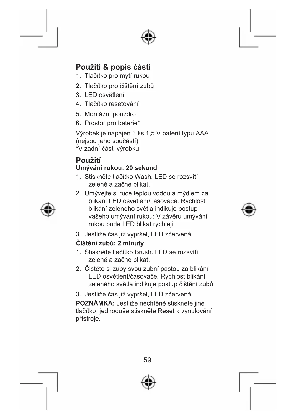 Výrobek je napájen 3 ks 1,5 V baterií typu AAA (nejsou jeho součástí) *V zadní části výrobku Použití Umývánírukou:20sekund