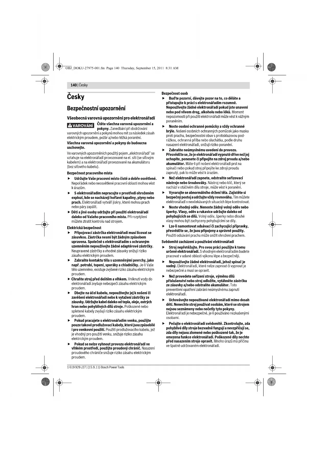 OBJ_DOKU-27975-001.fm Page 139 Thursday, September 15, 2011 8:31 AM140 | Česky 1 619 929 J27 | (15.9.11) Bosch Power Tools Česky