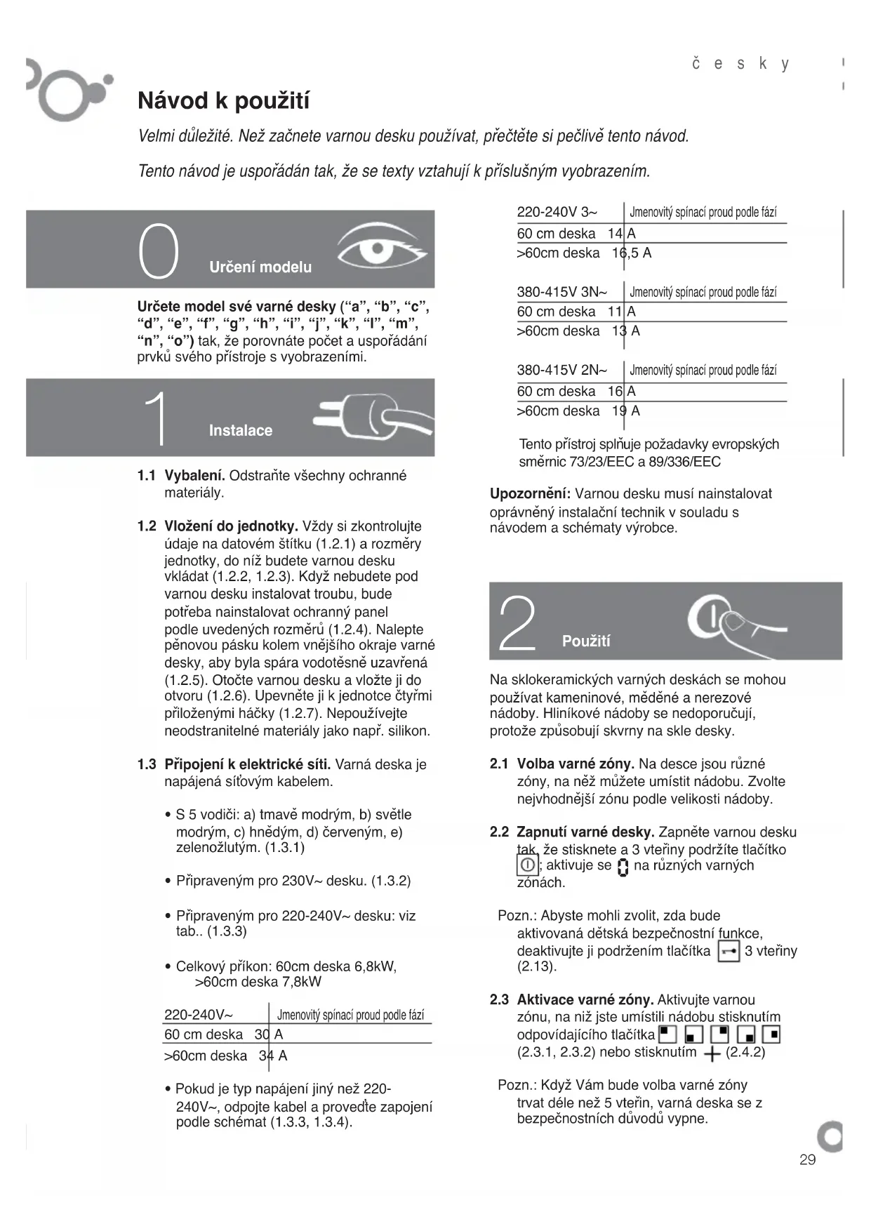 220-240V 3~ Jmenovitý spínací proud podle fází60 cm deska 14 A>60cm deska 16,5 A380-415V 3N~ Jmenovitý spínací proud podle fází60 cm deska 11 A>60cm deska 13 A380-415V 2N~ Jmenovitý spínací proud podle fází60 cm deska 16 A>60cm deska 19 A Tento přístroj splňuje požadavky evropských směrnic 73/23/EEC a 89/336/EECUpozornění: Varnou desku musí nainstalovat oprávněný instalační technik v souladu s návodem a schématy výrobce.