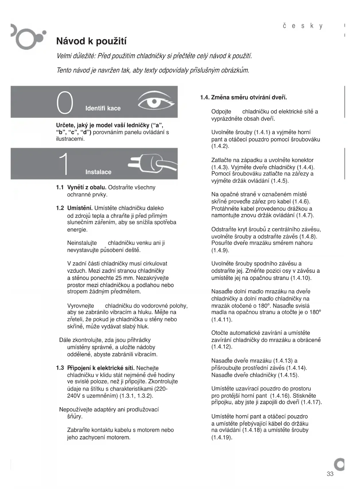 Identifi kace 1.4. Změna směru otvírání dveří. Odpojte chladničku od elektrické sítě a vyprázdněte obsah dveří. Uvolněte šrouby (1.4.1) a vyjměte horní pant a otáčecí pouzdro pomocí šroubováku (1.4.2). Zatlačte na západku a uvolněte konektor (1.4.3). Vyjměte dveře chladničky (1.4.4). Pomocí šroubováku zatlačte na zářezy a vyjměte držák ovládání (1.4.5). Na opačné straně v označeném místě skříně proveďte zářez pro kabel (1.4.6). Protáhněte kabel provedenou drážkou a namontujte znovu držák ovládání (1.4.7). Odstraňte kryt šroubů z centrálního závěsu, uvolněte šrouby a odstraňte závěs (1.4.8). Posuňte dveře mrazáku směrem nahoru (1.4.9). Uvolněte šrouby spodního závěsu a odstraňte jej. Změňte pozici osy v závěsu a umístěte jej na opačnou stranu (1.4.10). Nasaďte dolní madlo mrazáku na dveře chladničky a dolní madlo chladničky na mrazák otočené o 180º. Nasaďte svislá madla na opačnou stranu a otočte je o 180º (1.4.11). Otočte automatické zavírání a umístěte zavírání chladničky do mrazáku a obráceně (1.4.12). Nasaďte dveře mrazáku (1.4.13) a přišroubujte prostřední závěs (1.4.14). Nasaďte dveře chladničky (1.4.15). Umístěte uzavírací pouzdro do prostoru pro protější horní pant (1.4.16). Stiskněte přípojku, aby jste ji zapojili do dveří (1.4.17). Umístěte horní pant a otáčecí pouzdro a umístěte přebývající kábel do držáku na ovládání (1.4.18) a umístěte šrouby (1.4.19).č esky