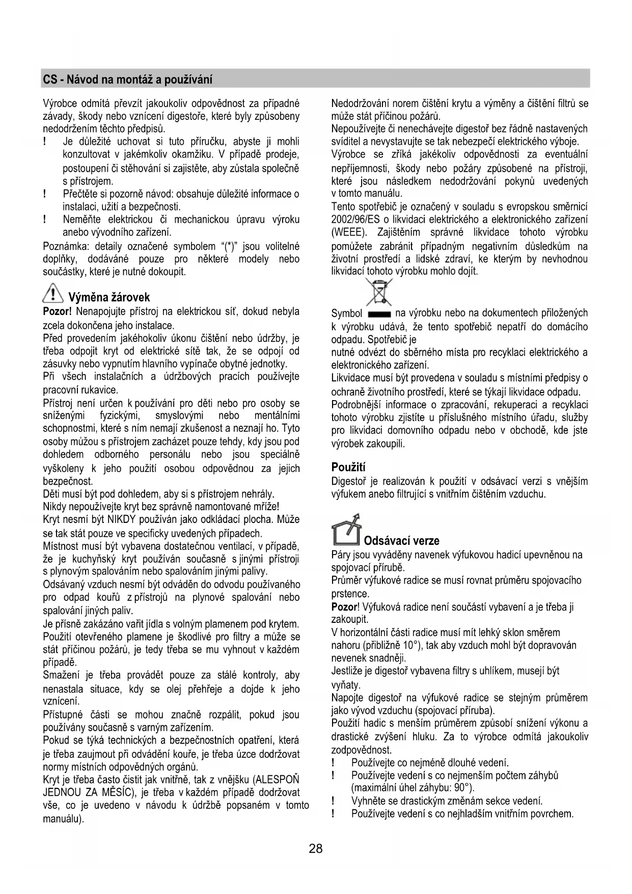 Nepoužívejte či nenechávejte digestoř bez řádně nastavených