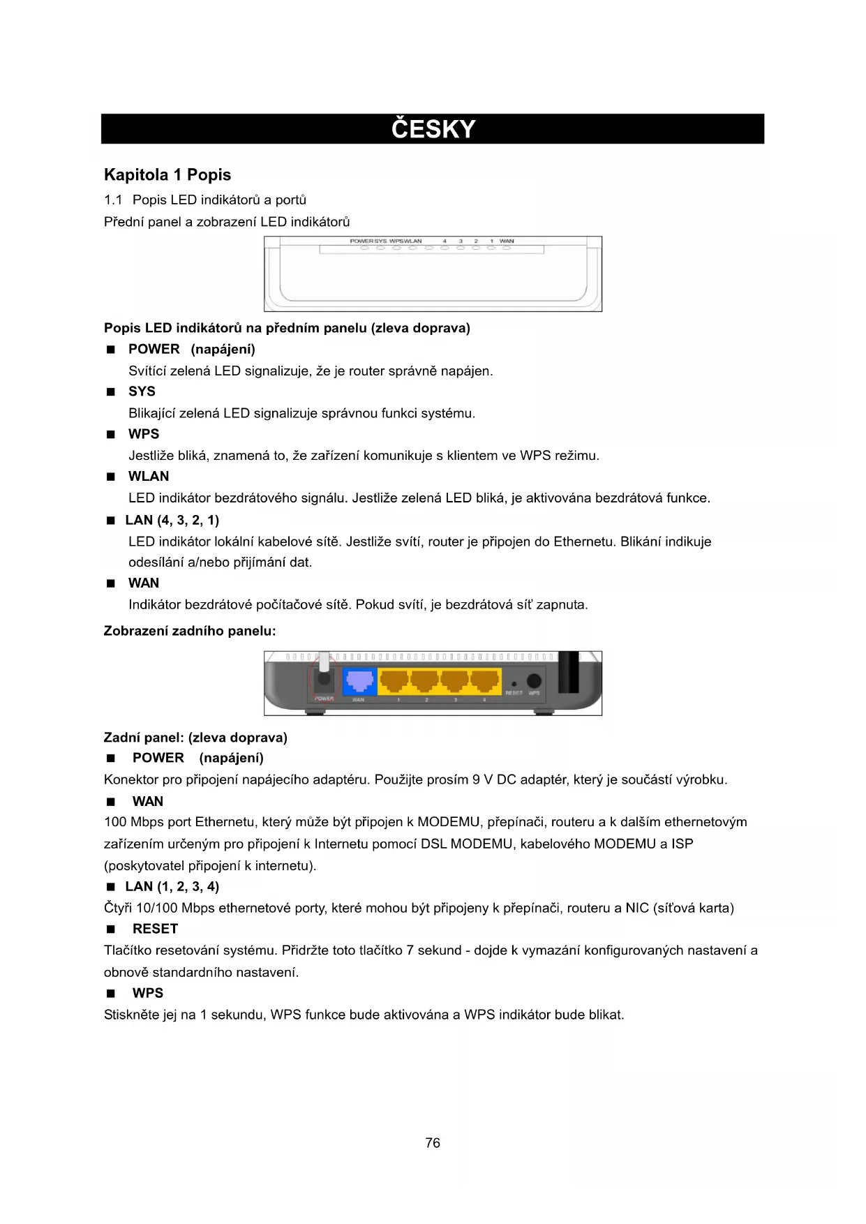 Přední panel a zobrazení LED indikátorů Popis LED indikátorů na předním panelu (zleva doprava) POWER (napájení) Svítící zelená LED signalizuje, že je router správně napájen. SYS Blikající zelená LED signalizuje správnou funkci systému. WPS Jestliže bliká, znamená to, že zařízení komunikuje s klientem ve WPS režimu. WLAN LED indikátor bezdrátového signálu. Jestliže zelená LED bliká, je aktivována bezdrátová funkce. LAN (4, 3, 2, 1) LED indikátor lokální kabelové sítě. Jestliže svítí, router je připojen do Ethernetu. Blikání indikuje odesílání a/nebo přijímání dat. WAN Indikátor bezdrátové počítačové sítě. Pokud svítí, je bezdrátová síť zapnuta. Zobrazení zadního panelu: Zadní panel: (zleva doprava) POWER (napájení) Konektor pro připojení napájecího adaptéru. Použijte prosím 9 V DC adaptér, který je součástí výrobku. WAN 100 Mbps port Ethernetu, který může být připojen k MODEMU, přepínači, routeru a k dalším ethernetovým zařízením určeným pro připojení k Internetu pomocí DSL MODEMU, kabelového MODEMU a ISP (poskytovatel připojení k internetu). LAN (1, 2, 3, 4) Čtyři 10/100 Mbps ethernetové porty, které mohou být připojeny k přepínači, routeru a NIC (síťová karta) RESET Tlačítko resetování systému. Přidržte toto tlačítko 7 sekund - dojde k vymazání konfigurovaných nastavení a obnově standardního nastavení. WPS Stiskněte jej na 1 sekundu, WPS funkce bude aktivována a WPS indikátor bude blikat.77 Kapitola 2: Instalace hardware