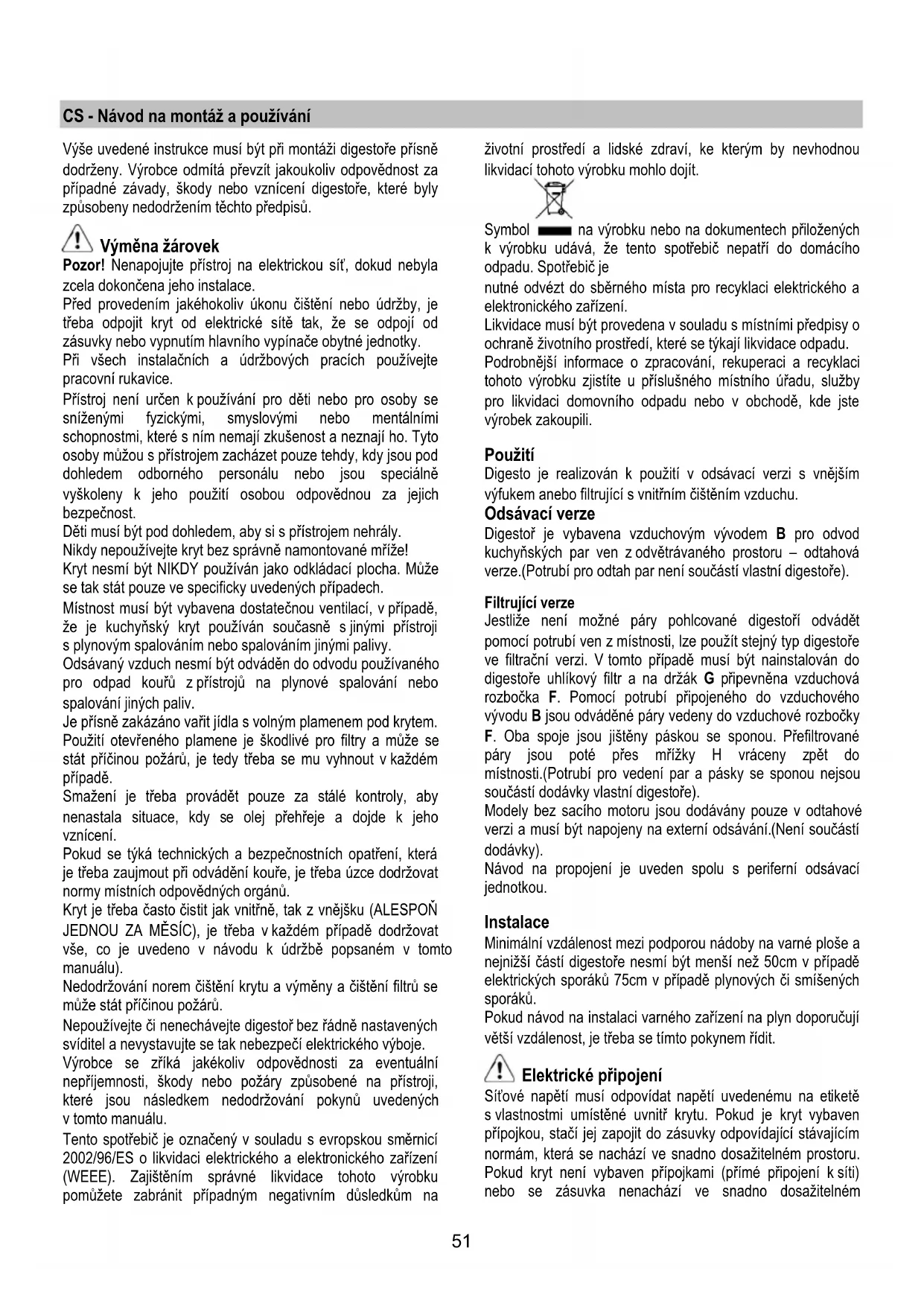 Výše uvedené instrukce musí být při montáži digestoře přísně