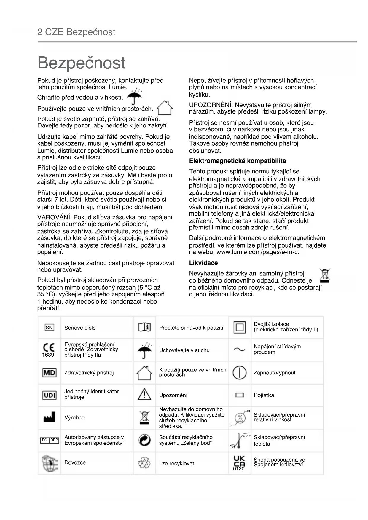 Evropské prohlášení oshodě: Zdravotnický přístroj třídy IIa Nevhazujte do domovního odpadu. K likvidaci využijte služeb recyklačního střediska. Dvojitá izolace (elektrické zařízení třídy II) Skladovací/přepravní relativní vlhkost Součástí recyklačního systému „Zelený bod“ Zapnout/Vypnout Pojistka Napájení střídavým proudem Pokud je přístroj poškozený, kontaktujte před jeho použitím společnost Lumie. Chraňte před vodou a vlhkostí. Používejte pouze ve vnitřních prostorách. Pokud je světlo zapnuté, přístroj se zahřívá. Dávejte tedy pozor, aby nedošlo k jeho zakrytí. Udržujte kabel mimo zahřáté povrchy. Pokud je kabel poškozený, musí jej vyměnit společnost Lumie, distributor společnosti Lumie nebo osoba s příslušnou kvalifikací. Přístroj lze od elektrické sítě odpojit pouze vytažením zástrčky ze zásuvky. Měli byste proto zajistit, aby byla zásuvka dobře přístupná. Přístroj mohou používat pouze dospělí a děti starší 7 let. Děti, které světlo používají nebo si v jeho blízkosti hrají, musí být pod dohledem. VAROVÁNÍ: Pokud síťová zásuvka pro napájení přístroje neumožňuje správné připojení, zástrčka se zahřívá. Zkontrolujte, zda je síťová zásuvka, do které se přístroj zapojuje, správně nainstalovaná, abyste předešli riziku požáru a popálení. Nepokoušejte se žádnou část přístroje opravovat nebo upravovat. Pokud byl přístroj skladován při provozních teplotách mimo doporučený rozsah (5 °C až 35 °C), vyčkejte před jeho zapojením alespoň 1 hodinu, aby nedošlo ke kondenzaci nebo přehřátí. Nepoužívejte přístroj v přítomnosti hořlavých plynů nebo na místech s vysokou koncentrací kyslíku. UPOZORNĚNÍ: Nevystavujte přístroj silným nárazům, abyste předešli riziku poškození lampy. Přístroj se nesmí používat u osob, které jsou v bezvědomí či v narkóze nebo jsou jinak indisponované, například pod vlivem alkoholu. Takové osoby rovněž nemohou přístroj obsluhovat. Elektromagnetická kompatibilita Tento produkt splňuje normu týkající se elektromagnetické kompatibility zdravotnických přístrojů a je nepravděpodobné, že by způsoboval rušení jiných elektrických a elektronických produktů v jeho okolí. Produkt však mohou rušit rádiová vysílací zařízení, mobilní telefony a jiná elektrická/elektronická zařízení. Pokud se tak stane, stačí produkt přemístit mimo dosah zdroje rušení. Další podrobné informace o elektromagnetickém prostředí, ve kterém lze přístroj používat, najdete na webu: www.lumie.com/pages/e-m-c. Likvidace Nevyhazujte žárovky ani samotný přístroj do běžného domovního odpadu. Odneste je na oficiální místo pro recyklaci, kde se postarají o jeho řádnou likvidaci.CZE 3 Bezpečnostní opatření Výzkum ukazuje, že je léčba světlem velmi bezpečná. V následujících případech se však nejprve poraďte se svým lékařem: Máte závažné oční problémy nebo jste podstoupili operaci očí. Bylo vám doporučeno vyhýbat se jasnému světlu nebo užíváte léky, které mohou způsobovat přecitlivělost na světlo. Byla vám diagnostikována deprese nebo jiná afektivní porucha či porucha spánku. Důležité je to zejména v případě, kdy na to užíváte také léky. Léčba světlem totiž může mít vliv i na vaši náladu. U některých lidí dochází k vedlejším účinkům (jako jsou například bolesti hlavy, únava očí, nevolnost a hyperaktivita), které jsou však většinou mírné a po vypnutí světla obvykle odezní. Během několika dalších dní dobu léčby postupně prodlužujte, abyste zjistili, co vám nejvíce vyhovuje. Někteří lidé si stěžují na potíže se spánkem, které jsou často způsobeny aplikací světla nedlouho před spaním. Pokud se u vás při používání přístroje Brazil vyskytnou jakékoli problémy nebo pokud světlo používáte již týden, ale nezaznamenali jste žádný přínos, obraťte se na společnost Lumie nebo se poraďte se svým lékařem. DŮLEŽITÉ: Pokyny v tomto příbalovém letáku nelze chápat jako lékařské pokyny k léčbě jakéhokoli stavu. Pokud vám léčbu světlem doporučil lékař, dodržujte jeho pokyny a o případných účincích se poraďte s ním.