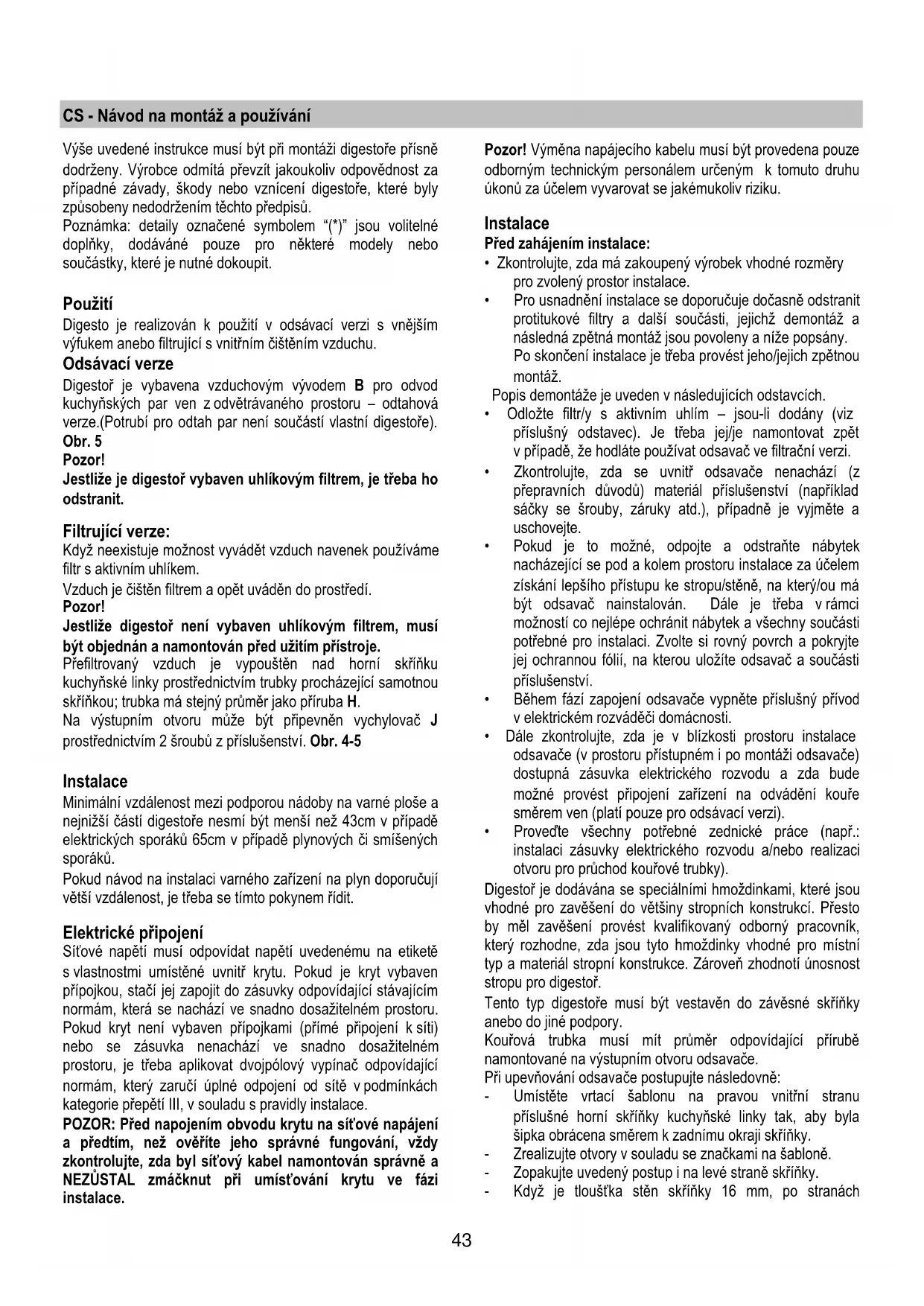 Výše uvedené instrukce musí být při montáži digestoře přísně