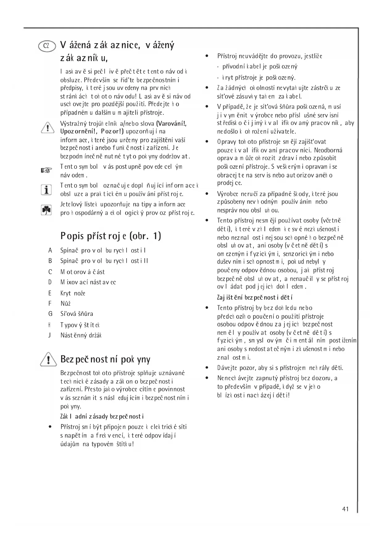 Bezpečnost toh oto pristroje splnju uznávané tech nické zásady a zák on o bezpeč nosti zarizení. Presto jak o vyrobce citim e povinnost vássezám it s nasl eduj icim i bezpeč nost nim i pouk yny.