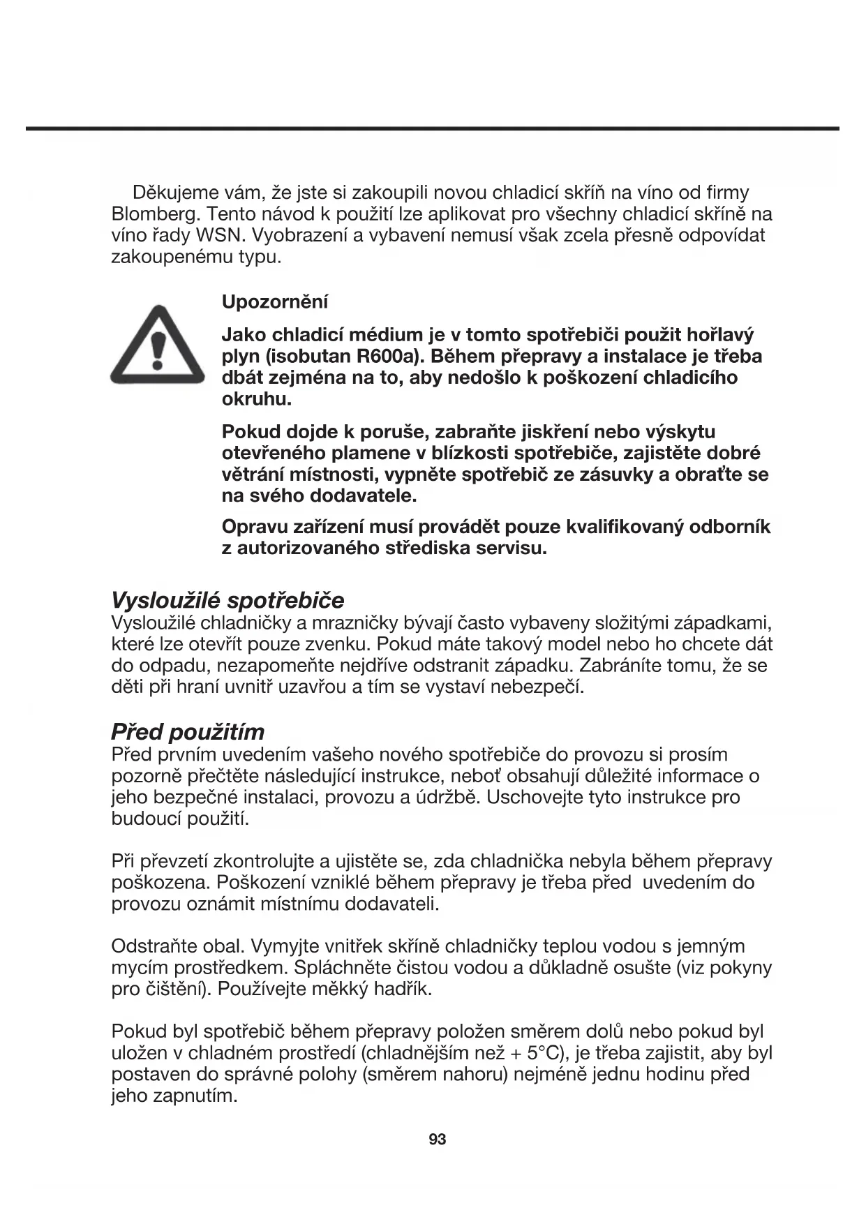 Garantía, repuestos y servicio92 Además, al desechar el electrodoméstico es imperativo cumplir las normativas de protección del medio ambiente. Para desechar el electrodoméstico le recomendamos comunicarse con el departamento técnico de la autoridad pertinente en su localidad, donde le informarán sobre cómo se realizan la recolección y el reciclaje de dichas unidades en su región. Este aparato lleva el marcado CE en conformidad con la Directiva 2002/96/EC del Parlamento Europeo y del Consejo sobre residuos de aparatos eléctricos y electrónicos (RAEE). La correcta eliminación de este producto evita consecuencias negativas para el medioambiente y la salud. El símbolo en el producto o en los documentos que se incluyen con el producto, indica que no se puede tratar como residuo doméstico. Es necesario entregarlo en un punto de recogida para reciclar aparatos eléctricos y electrónicos. Deséchelo con arreglo a las normas medioambientales para eliminación de residuos. Para obtener información más detallada sobre el tratamiento, recuperación y reciclaje de este producto, póngase en contacto con el ayuntamiento, con el servicio de eliminación de residuos urbanos o la tienda donde adquirió el producto. Eliminación del aparato93 Děkujeme vám, že jste si zakoupili novou chladicí skříň na víno od firmy Blomberg. Tento návod k použití lze aplikovat pro všechny chladicí skříně na víno řady WSN. Vyobrazení a vybavení nemusí však zcela přesně odpovídat zakoupenému typu. Upozornění Jako chladicí médium je v tomto spotřebiči použit hořlavý plyn (isobutan R600a). Během přepravy a instalace je třeba dbát zejména na to, aby nedošlo k poškození chladicího okruhu. Pokud dojde k poruše, zabraňte jiskření nebo výskytu otevřeného plamene v blízkosti spotřebiče, zajistěte dobré větrání místnosti, vypněte spotřebič ze zásuvky a obraťte se na svého dodavatele. Opravu zařízení musí provádět pouze kvalifikovaný odborník z autorizovaného střediska servisu. Vysloužilé spotřebiče Vysloužilé chladničky a mrazničky bývají často vybaveny složitými západkami, které lze otevřít pouze zvenku. Pokud máte takový model nebo ho chcete dát do odpadu, nezapomeňte nejdříve odstranit západku. Zabráníte tomu, že se děti při hraní uvnitř uzavřou a tím se vystaví nebezpečí. Před použitím Před prvním uvedením vašeho nového spotřebiče do provozu si prosím pozorně přečtěte následující instrukce, neboť obsahují důležité informace o jeho bezpečné instalaci, provozu a údržbě. Uschovejte tyto instrukce pro budoucí použití. Při převzetí zkontrolujte a ujistěte se, zda chladnička nebyla během přepravy poškozena. Poškození vzniklé během přepravy je třeba před uvedením do provozu oznámit místnímu dodavateli. Odstraňte obal. Vymyjte vnitřek skříně chladničky teplou vodou s jemným mycím prostředkem. Spláchněte čistou vodou a důkladně osušte (viz pokyny pro čištění). Používejte měkký hadřík. Pokud byl spotřebič během přepravy položen směrem dolů nebo pokud byl uložen v chladném prostředí (chladnějším než + 5°C), je třeba zajistit, aby byl postaven do správné polohy (směrem nahoru) nejméně jednu hodinu před jeho zapnutím.94 Seznamte se s chladničkou Osvětlení Uhlíkový filtr Dřevěná police Těsnicí páska Výrobní štítek Madlo dveří Krycí panel Ovládací panel Zámek Nastavitelné nožičky Obrázek 195 Umístění Z bezpečnostních a provozních důvodů nesmí být spotřebič umístěn venku. Spotřebič má být umístěn v suché a dobře větrané místnosti (při maximální relativní vlhkosti 75 %). Nikdy neinstalujte spotřebič v blízkosti tepelných zdrojů, jako jsou sporáky nebo radiátory a vyhněte se umístění spotřebičů na přímém slunečním záření. Okolní teplota Klimatická třída je uvedena na výrobním štítku (viz obrázek 1 na straně 94 a obrázek 11 na straně 104). Specifikuje za jaké okolní teploty chladnička pracuje optimálně. Skříně na chlazení vína se „zimním nastavením“ fungují do teploty místnosti 5 ºC. Instalace Povrch, na kterém bude umístěn spotřebič, musí být rovný. Nepoužívejte sokl nebo podobné pomůcky. Spotřebič lze instalovat jako volně stojící zařízení u zdi, zabudovaný v kuchyňské lince nebo v sestavě s jinými spotřebiči (obrázek 2 a obrázek 3). Uvedení do provozu a instalace