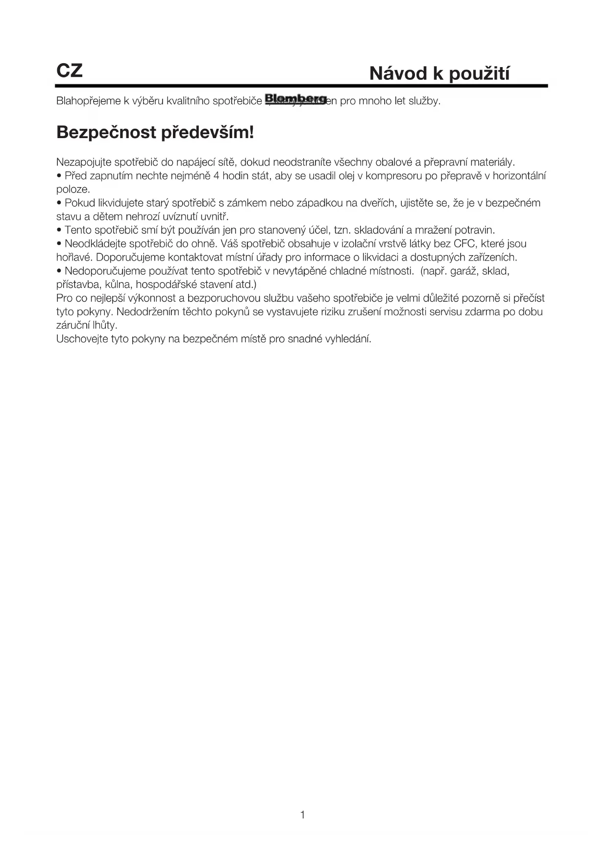 Blahopřejeme k výběru kvalitního spotřebiče , který je určen pro mnoho let služby. Bezpečnost především! Nezapojujte spotřebič do napájecí sítě, dokud neodstraníte všechny obalové a přepravní materiály.