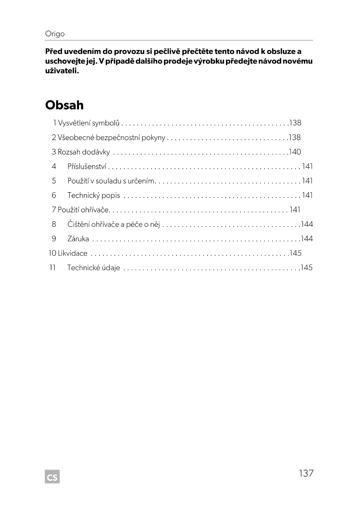 11 Technické údaje . . . . . . . . . . . . . . . . . . . . . . . . . . . . . . . . . . . . . . . . . . . . . .145CS Vysvětlení symbolů Origo