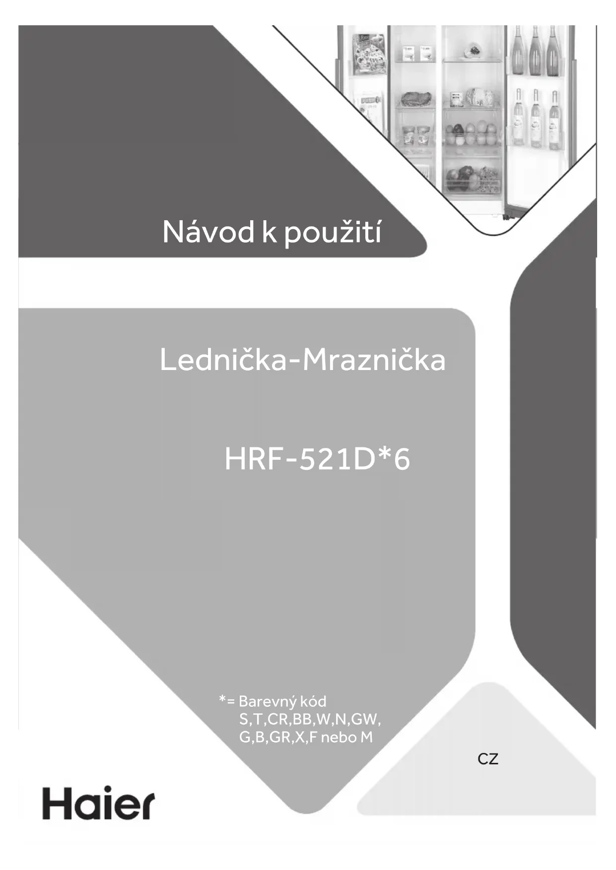 Návod k použití Lednička-Mraznička HRF-521D*6 *= Barevný kód S,T,CR,BB,W,N,GW, G,B,GR,X,F nebo MCZ CZ Popis Upozornění - Důležité poučení o bezpečnosti Obecné informace a tipy Sdělení týkající se životního prostředí Likvidace Pomozte chránit životní prostředí a lidské zdraví. Obal spotřebiče vyhoďte do příslušného kontejneru, aby mohl být recyklován. Pomozte recyklovat odpad z elektrických a elektronických přístrojů. Nevyhazu- jte přístroje označené tímto symbolem do běžného odpadu z domácnosti. Vraťte výrobek do místního zařízení pro recyklaci nebo se obraťte na svůj městský úřad. Děkujeme Vám, že jste si zakoupili spotřebič Haier. Před použitím spotřebiče si prosím pečlivě pročtěte tento návod. V návodu najdete důležité informace, díky nimž budete svůj spotřebič využívat naplno, zajistíte bezpečnou a správnou instalaci, použití a údržbu. Uchovávejte tento návod na vhodném místě, abyste ho měli vždy po ruce a mohli tak spotřebič používat bezpečně a správně. Pokud spotřebič prodáte, darujete nebo necháte v domě/bytě např. po stěhování, zajistěte předání návodu, aby se nový majitel spotřebiče mohl seznámit s pokyny pro jeho bezpečné používání. UPOZORNĚNÍ! Nebezpečí zranění nebo udušení! Chladivo a plyny se musí zlikvidovat profesionálně. Před řádnou likvidací se ujistěte, že potrubí chladicího okruhu není poškozeno. Odpojte spotřebič od elektrické sítě. Odřízněte kabel pro připojení do elektrické sítě a zlikvidujte ho. Aby nedošlo k zavření dětí nebo domácích mazlíčků do spotřebiče, odstraňte zásobníky a zásuvky a odmon- tujte západku dveří a těsnění. Děkujeme