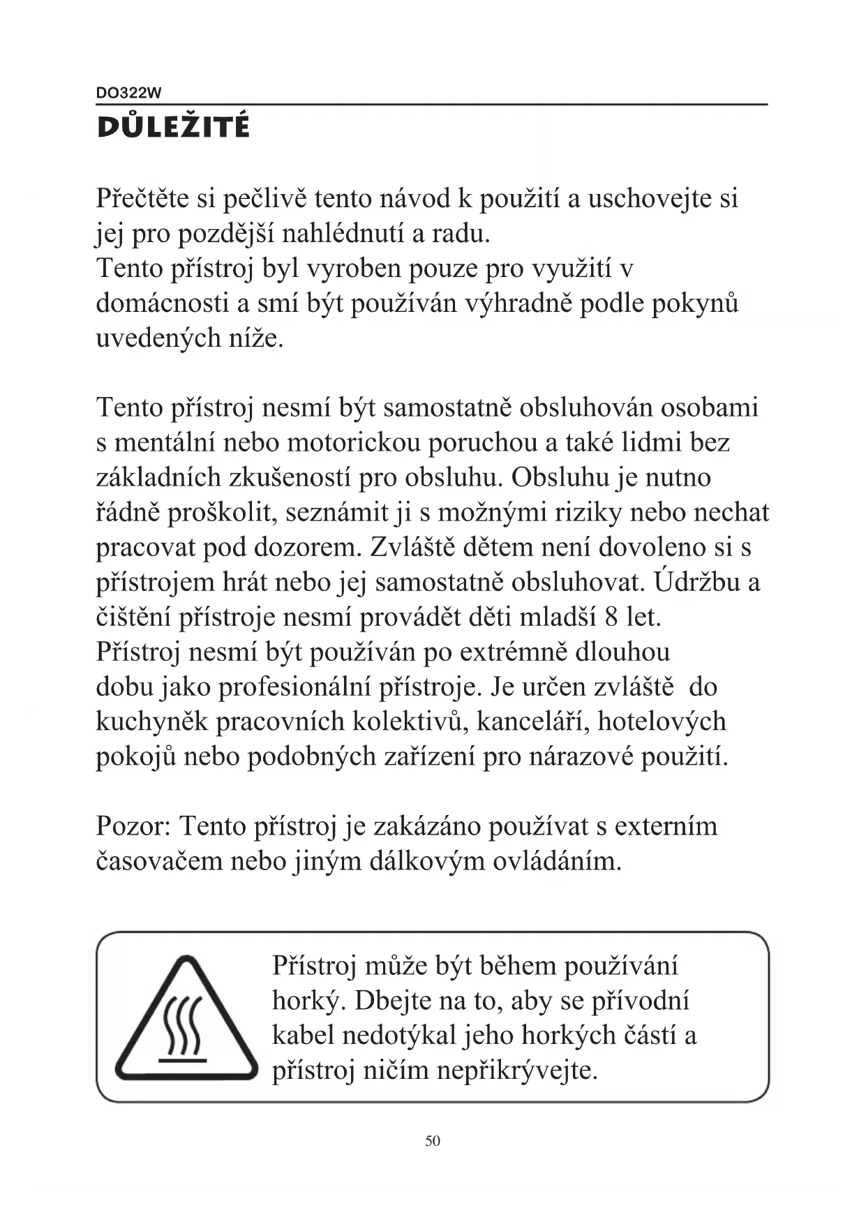 Přečtěte si pečlivě tento návod k použití a uschovejte si jej pro pozdější nahlédnutí a radu. Tento přístroj byl vyroben pouze pro využití v domácnosti a smí být používán výhradně podle pokynů uvedených níže. Tento přístroj nesmí být samostatně obsluhován osobami s mentální nebo motorickou poruchou a také lidmi bez základních zkušeností pro obsluhu. Obsluhu je nutno řádně proškolit, seznámit ji s možnými riziky nebo nechat pracovat pod dozorem. Zvláště dětem není dovoleno si s přístrojem hrát nebo jej samostatně obsluhovat. Údržbu a čištění přístroje nesmí provádět děti mladší 8 let. Přístroj nesmí být používán po extrémně dlouhou dobu jako profesionální přístroje. Je určen zvláště do kuchyněk pracovních kolektivů, kanceláří, hotelových pokojů nebo podobných zařízení pro nárazové použití. Pozor: Tento přístroj je zakázáno používat s externím časovačem nebo jiným dálkovým ovládáním. Přístroj může být během používání horký. Dbejte na to, aby se přívodní kabel nedotýkal jeho horkých částí a přístroj ničím nepřikrývejte.DO322W