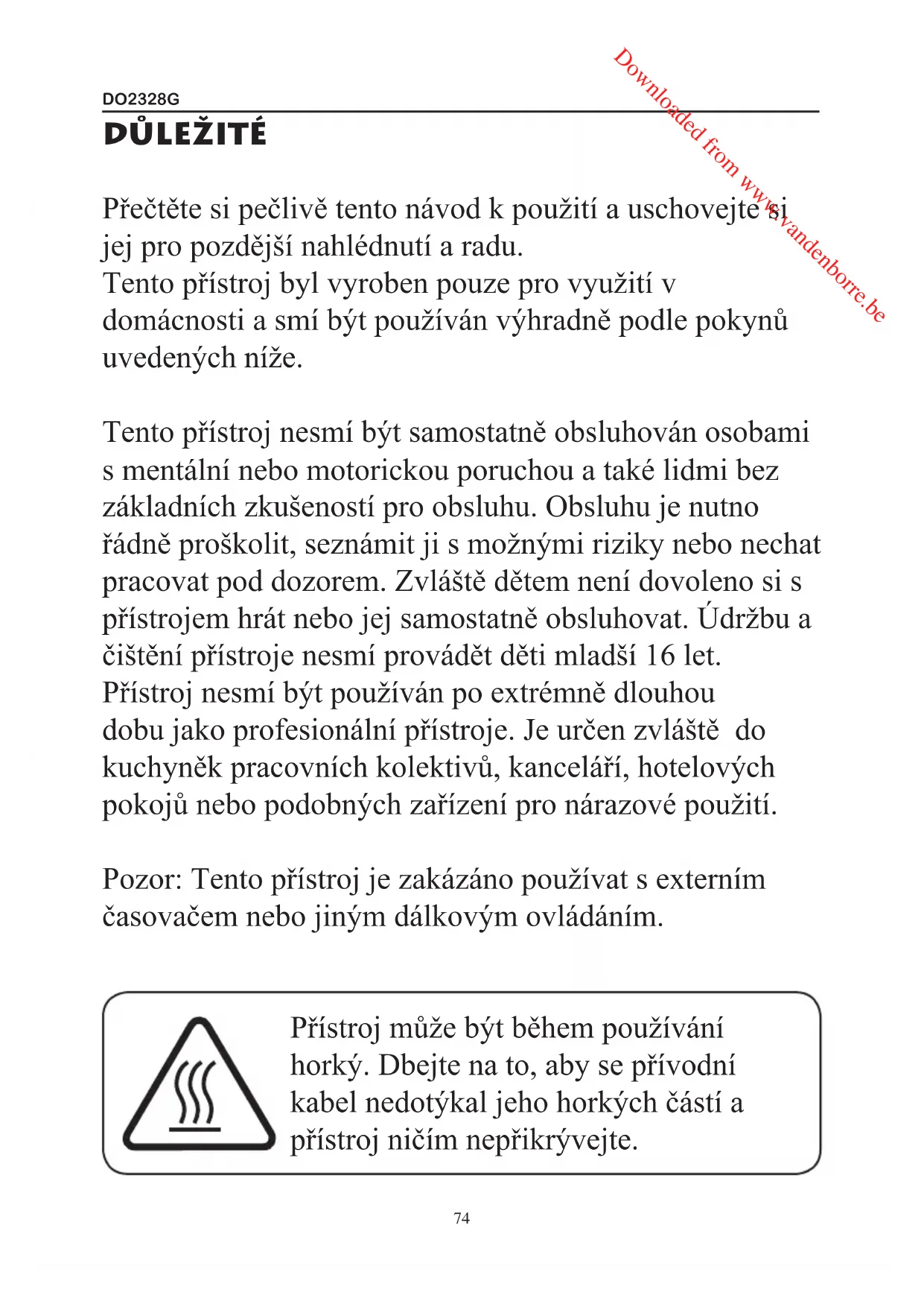 Přečtěte si pečlivě tento návod k použití a uschovejte si jej pro pozdější nahlédnutí a radu. Tento přístroj byl vyroben pouze pro využití v domácnosti a smí být používán výhradně podle pokynů uvedených níže. Tento přístroj nesmí být samostatně obsluhován osobami s mentální nebo motorickou poruchou a také lidmi bez základních zkušeností pro obsluhu. Obsluhu je nutno řádně proškolit, seznámit ji s možnými riziky nebo nechat pracovat pod dozorem. Zvláště dětem není dovoleno si s přístrojem hrát nebo jej samostatně obsluhovat. Údržbu a čištění přístroje nesmí provádět děti mladší 16 let. Přístroj nesmí být používán po extrémně dlouhou dobu jako profesionální přístroje. Je určen zvláště do kuchyněk pracovních kolektivů, kanceláří, hotelových pokojů nebo podobných zařízení pro nárazové použití. Pozor: Tento přístroj je zakázáno používat s externím časovačem nebo jiným dálkovým ovládáním. Přístroj může být během používání horký. Dbejte na to, aby se přívodní kabel nedotýkal jeho horkých částí a přístroj ničím nepřikrývejte. Downloaded from www.vandenborre.beDO2328G