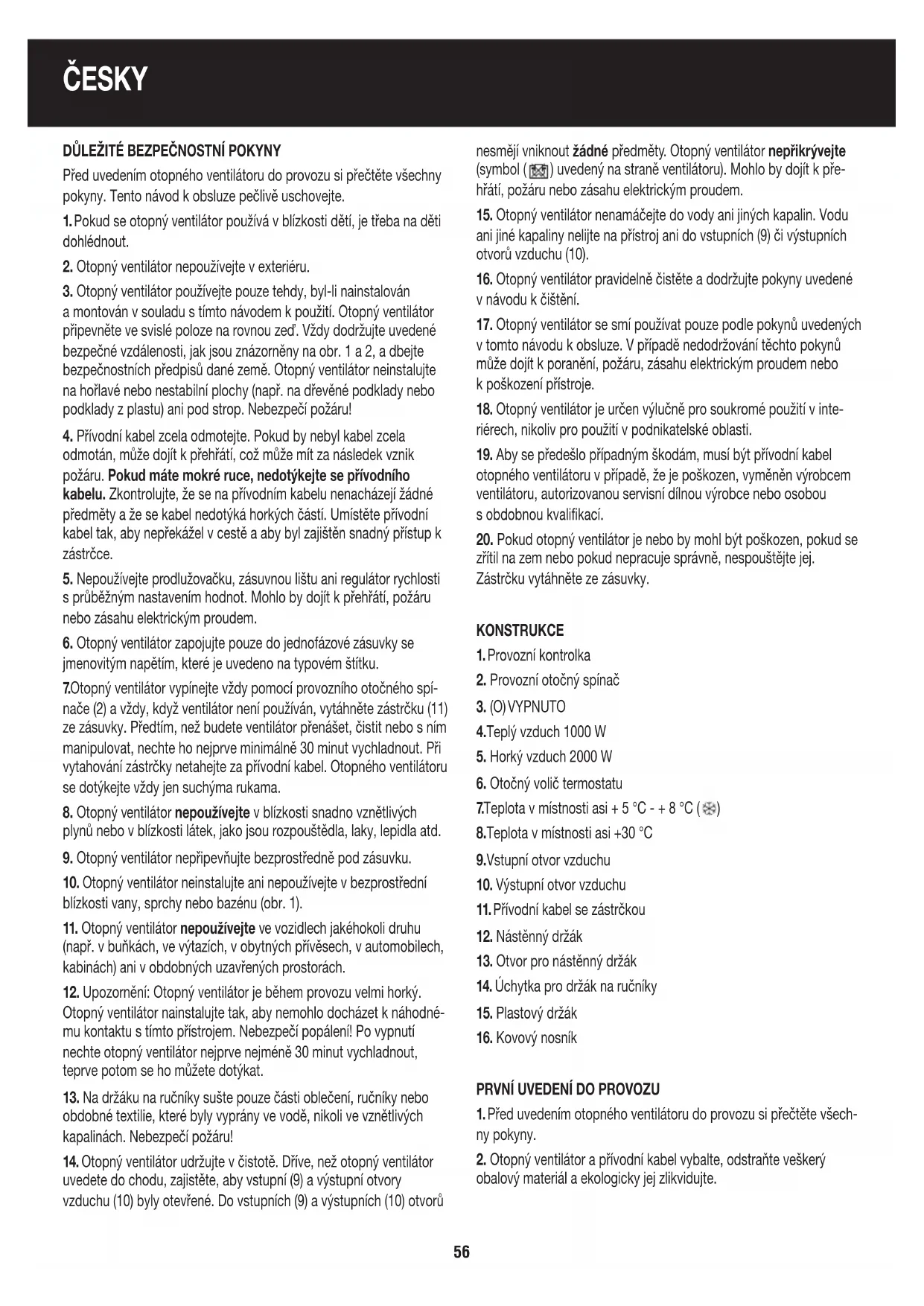 Před uvedením otopného ventilátoru do provozu si přečtěte všechny pokyny. Tento návod k obsluze pečlivě uschovejte.