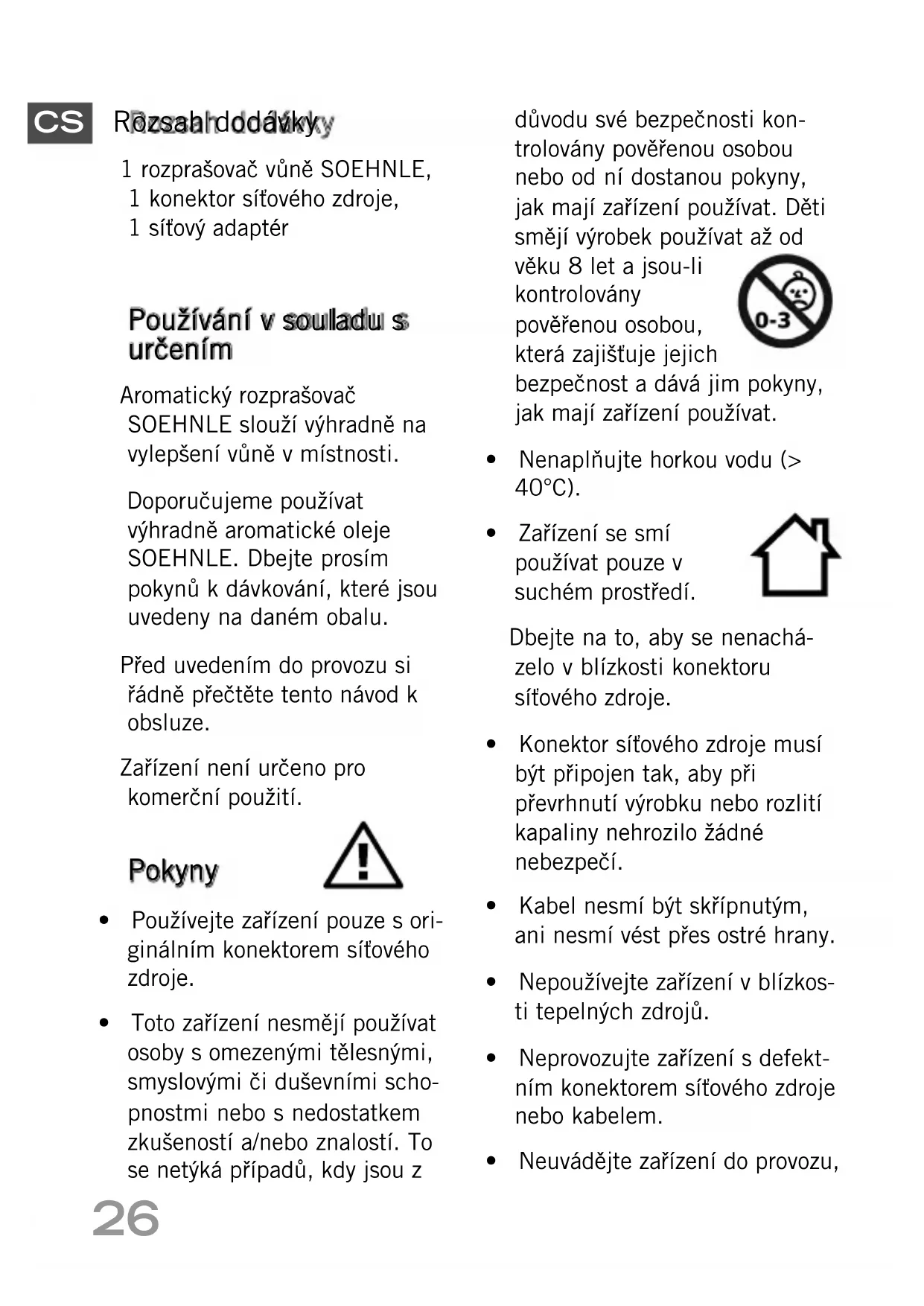 Rozsah dodávky 1 rozprašovač vůně SOEHNLE, 1 konektor síťového zdroje, 1 síťový adaptér Používání v souladu s určením Aromatický rozprašovač SOEHNLE slouží výhradně na vylepšení vůně v místnosti. Doporučujeme používat výhradně aromatické oleje SOEHNLE. Dbejte prosím pokynů k dávkování, které jsou uvedeny na daném obalu. Před uvedením do provozu si řádně přečtěte tento návod k obsluze. Zařízení není určeno pro komerční použití. Pokyny
