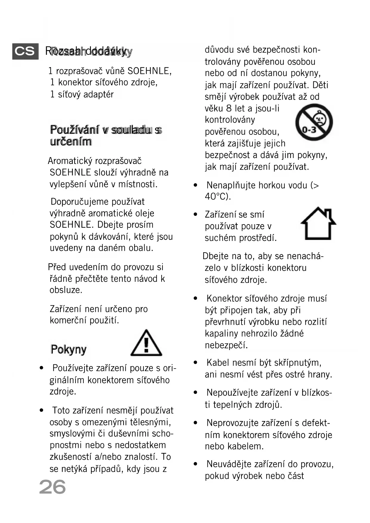 ætsende rengøringsmidler. C. Tekniske data Dimensioner Ø 107 x 212 mm Mærkespænding: 24V⎓ Mærkeeffekt: 10 W Vandindhold: 100ml Strømforsyning: Model: K13S240050G Indgang: 100-240V~50/60Hz 0.5A Udgang: 24V⎓ 500 mA ta=40°C Model: NLB050240W1U3 Indgang: 100-240V~50/60Hz 0.4A Max Udgang: 24V⎓ 500 mA ta=40°C 068025_Valencia_Content_6008-C_15-09-2014.indd 25 16.09.2014 09:58:3426 Rozsah dodávky 1 rozprašovač vůně SOEHNLE, 1 konektor síťového zdroje, 1 síťový adaptér Používání v souladu s určením Aromatický rozprašovač SOEHNLE slouží výhradně na vylepšení vůně v místnosti. Doporučujeme používat výhradně aromatické oleje SOEHNLE. Dbejte prosím pokynů k dávkování, které jsou uvedeny na daném obalu. Před uvedením do provozu si řádně přečtěte tento návod k obsluze.