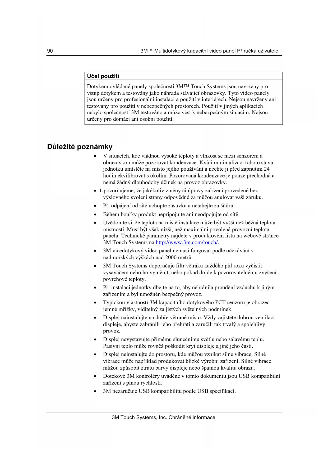 - Dříve než toto zařízení použijete, seznamte se s bezpečnostními informacemi, uvedenými v Úvodní příručce na webu www.3M.co.uk/TouchUserGuides. Úvodní příručku si uchovejte pro budoucí potřebu.89 3M™ Multidotykový kapacitní video panel Příručka uživatele 3M Touch Systems, Inc. Chráněné informace Obsah Důležité poznámky p. 90
