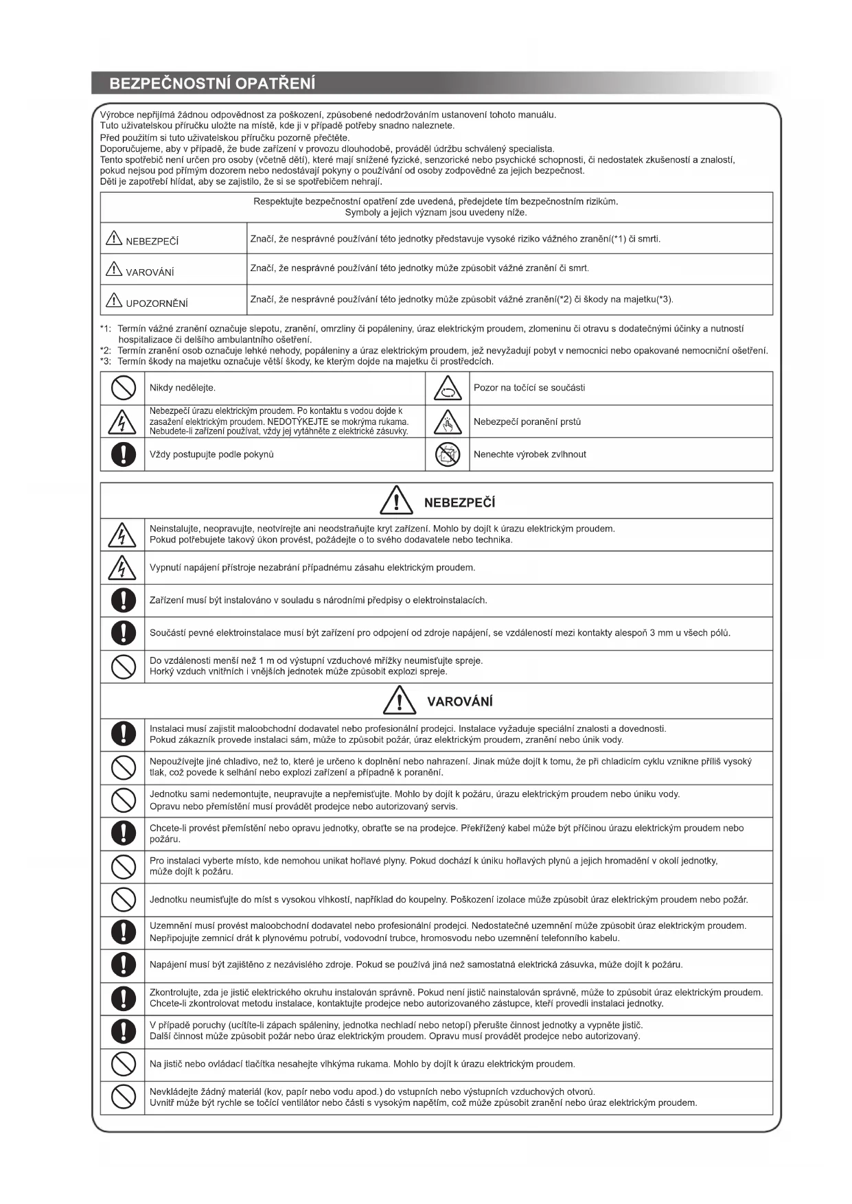 Výrobce nepřijímá žádnou odpovědnost za poškození, způsobené nedodržováním ustanovení tohoto manuálu. Tuto uživatelskou příručku uložte na místě, kde ji v případě potřeby snadno naleznete. Před použitím si tuto uživatelskou příručku pozorně přečtěte. Doporučujeme, aby v případě, že bude zařízení v provozu dlouhodobě, prováděl údržbu schválený specialista. Tento spotřebič není určen pro osoby (včetně dětí), které mají snížené fyzické, senzorické nebo psychické schopnosti, či nedostatek zkušeností a znalostí, pokud nejsou pod přímým dozorem nebo nedostávají pokyny o používání od osoby zodpovědné za jejich bezpečnost. Děti je zapotřebí hlídat, aby se zajistilo, že si se spotřebičem nehrají. Respektujte bezpečnostní opatření zde uvedená, předejdete tím bezpečnostním rizikům. Symboly a jejich význam jsou uvedeny níže. 0 NEBEZPEČÍ Značí, že nesprávné používání této jednotky představuje vysoké riziko vážného zranění(*1) či smrti. 0 VAROVÁNÍ Značí, že nesprávné používání této jednotky může způsobit vážné zranění či smrt. 0 UPOZORNĚNÍ Značí, že nesprávné používání této jednotky může způsobit vážné zranění(*2) či škody na majetku(*3). *1: Termín vážné zranění označuje slepotu, zranění, omrzliny či popáleniny, úraz elektrickým proudem, zlomeninu či otravu s dodatečnými účinky a nutností hospitalizace či delšího ambulantního ošetření. *2: Termín zranění osob označuje lehké nehody, popáleniny a úraz elektrickým proudem, jež nevyžadují pobyt v nemocnici nebo opakované nemocniční ošetření. *3: Termín škody na majetku označuje větší škody, ke kterým dojde na majetku či prostředcích.