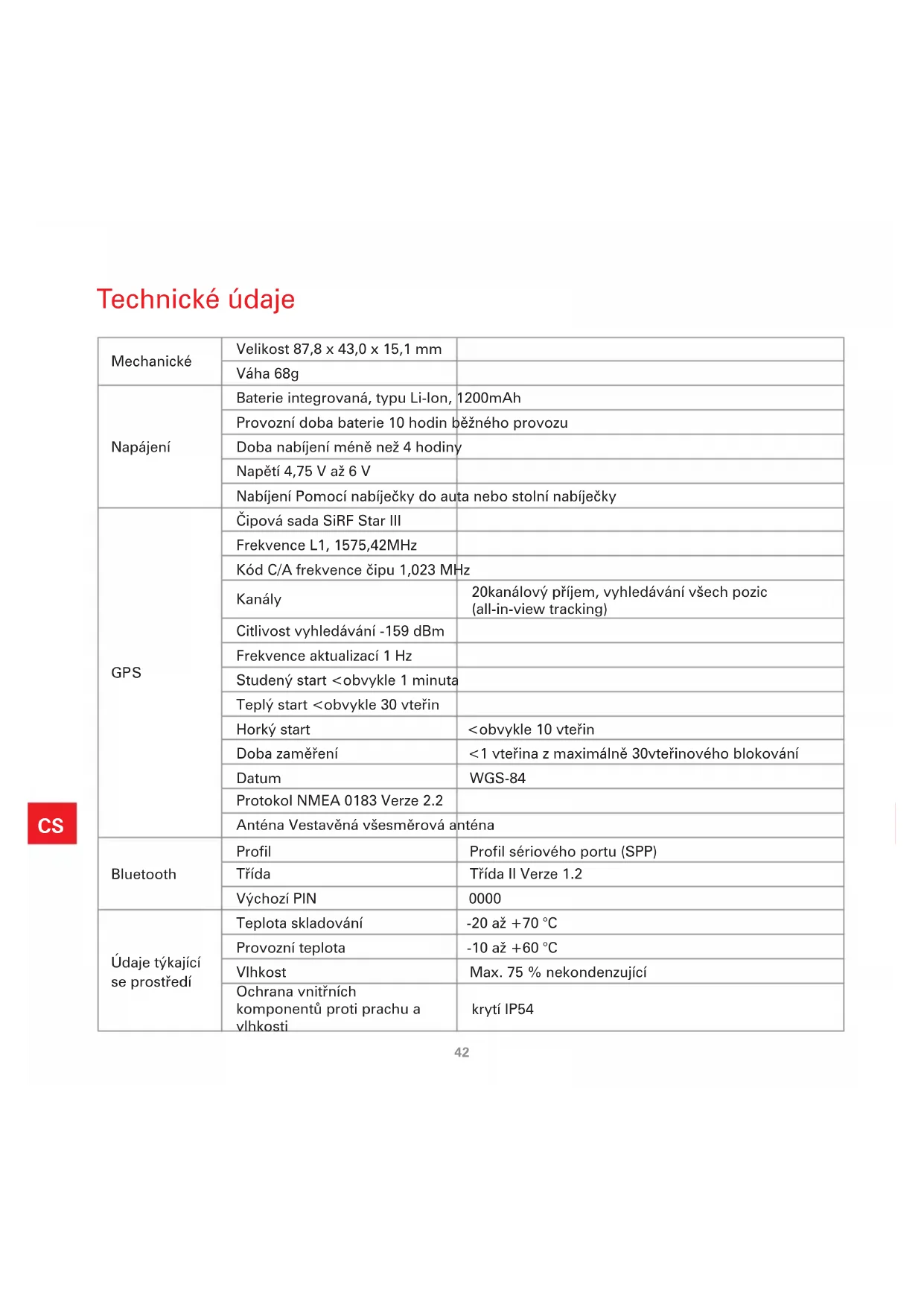 Mechanické Velikost 87,8 x 43,0 x 15,1 mm Váha 68g Napájení Baterie integrovaná, typu Li-Ion, 1200mAh Provozní doba baterie 10 hodin běžného provozu Doba nabíjení méně než 4 hodiny Napětí 4,75 V až 6 V Nabíjení Pomocí nabíječky do auta nebo stolní nabíječky GPS Čipová sada SiRF Star III Frekvence L1, 1575,42MHz Kód C/A frekvence čipu 1,023 MHz Kanály 20kanálový příjem, vyhledávání všech pozic (all-in-view tracking) Citlivost vyhledávání -159 dBm Frekvence aktualizací 1 Hz Studený start <obvykle 1 minuta Teplý start <obvykle 30 vteřin Horký start <obvykle 10 vteřin Doba zaměření <1 vteřina z maximálně 30vteřinového blokování Datum WGS-84 Protokol NMEA 0183 Verze 2.2 Anténa Vestavěná všesměrová anténa Bluetooth Prol Prol sériového portu (SPP) Třída Třída II Verze 1.2 Výchozí PIN 0000 Údaje týkající se prostředí Teplota skladování -20 až +70 °C Provozní teplota -10 až +60 °C Vlhkost Max. 75 % nekondenzující Ochrana vnitřních komponentů proti prachu a vlhkosti krytí IP54 Technické údaje42