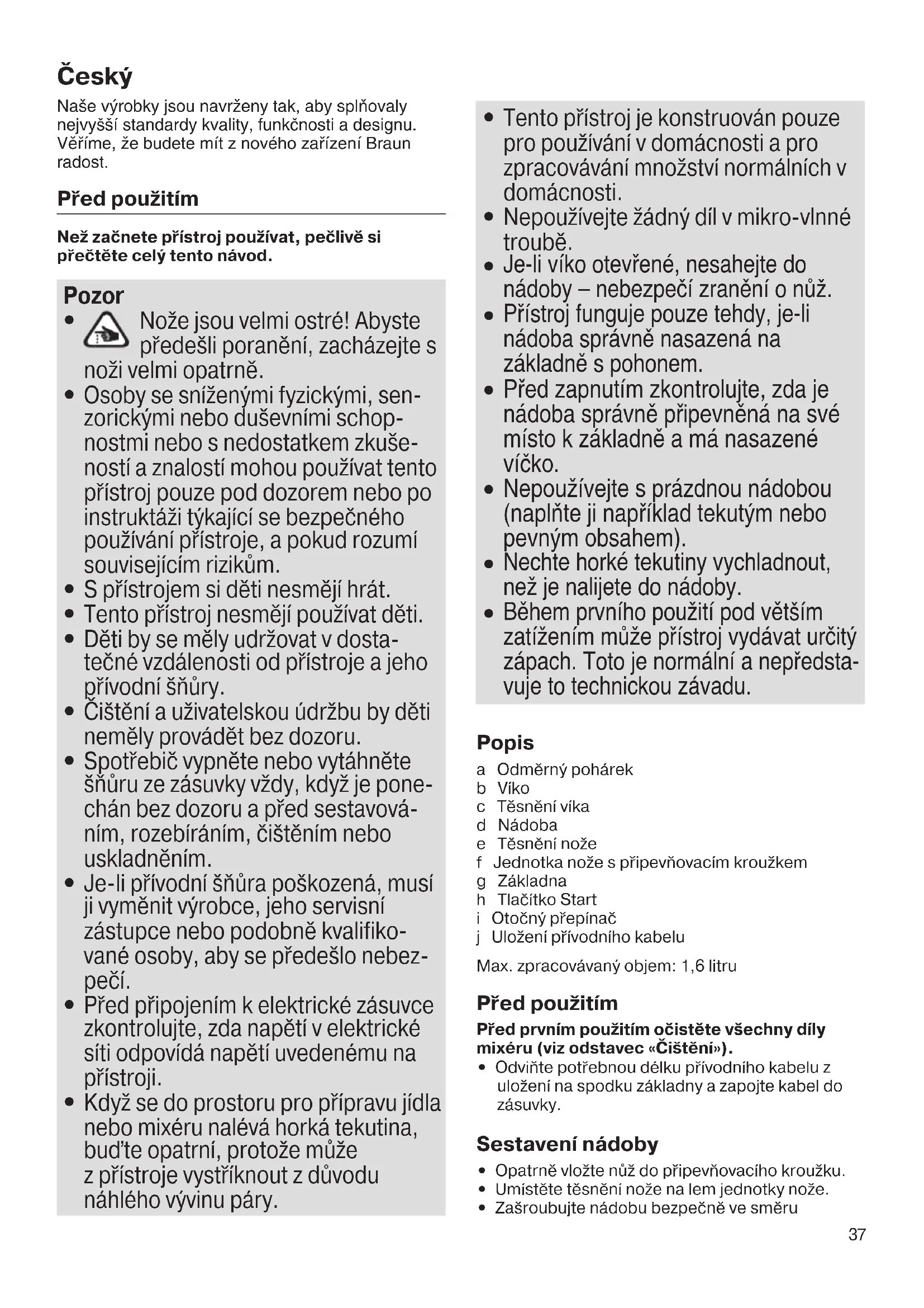 Během prvního použití pod větším zatížením může přístroj vydávat určitý zápach. Toto je normální a nepředsta- vuje to technickou závadu. Popis a Odměrný pohárek b Víko c Těsnění víka d Nádoba e Těsnění nože f Jednotka nože s připevňovacím kroužkem g Základna h Tlačítko Start i Otočný přepínač j Uložení přívodního kabelu Max. zpracovávaný objem: 1,6 litru Před použitím Před prvním použitím očistěte všechny díly mixéru (viz odstavec «Čištění»).