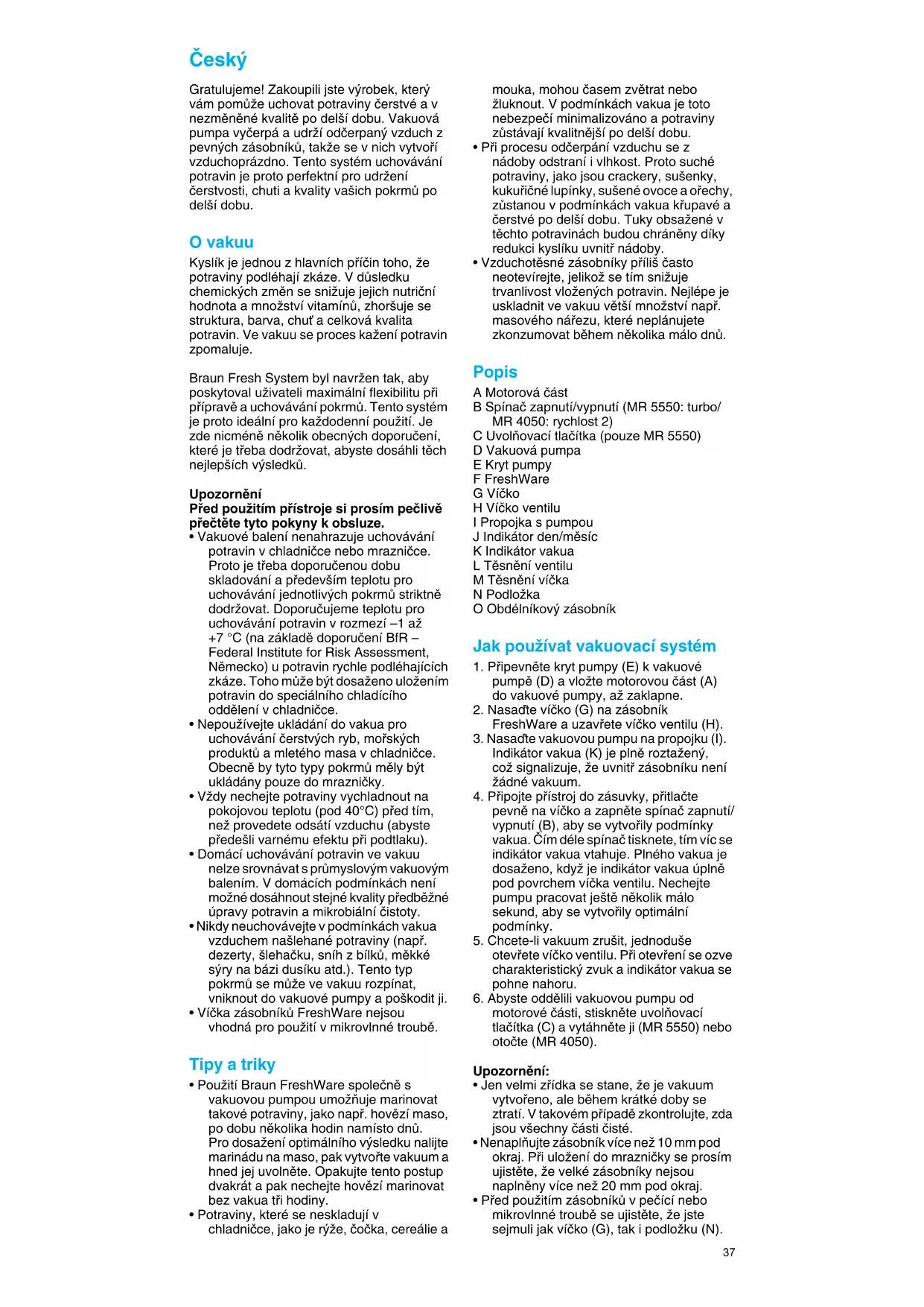 zakupu potwierdzonej pieczàtkà i podpisem sprzedawcy karta gwarancyjna jest niewa˝na. 10.Niniejsza gwarancja na sprzedany towar konsumpcyjny nie wy∏àcza, nie ogranicza ani nie zawiesza uprawnieƒ Kupujàcego wynikajàcych z niezgodnoÊci towaru z umowà. 4162355_DaVinci Seite 36 Mittwoch, 29. November 2006 3:14 1537 Gratulujeme! Zakoupili jste v˘robek, kter˘ vám pomÛÏe uchovat potraviny ãerstvé a v nezmûnûné kvalitû po del‰í dobu. Vakuová pumpa vyãerpá a udrÏí odãerpan˘ vzduch z pevn˘ch zásobníkÛ, takÏe se v nich vytvofií vzduchoprázdno. Tento systém uchovávání potravin je proto perfektní pro udrÏení ãerstvosti, chuti a kvality va‰ich pokrmÛ po del‰í dobu. O vakuu Kyslík je jednou z hlavních pfiíãin toho, Ïe potraviny podléhají zkáze. V dÛsledku chemick˘ch zmûn se sniÏuje jejich nutriãní hodnota a mnoÏství vitamínÛ, zhor‰uje se struktura, barva, chuÈ a celková kvalita potravin. Ve vakuu se proces kaÏení potravin zpomaluje. Braun Fresh System byl navrÏen tak, aby poskytoval uÏivateli maximální flexibilitu pfii pfiípravû a uchovávání pokrmÛ. Tento systém je proto ideální pro kaÏdodenní pouÏití. Je zde nicménû nûkolik obecn˘ch doporuãení, které je tfieba dodrÏovat, abyste dosáhli tûch nejlep‰ích v˘sledkÛ. Upozornûní Pfied pouÏitím pfiístroje si prosím peãlivû pfieãtûte tyto pokyny k obsluze.