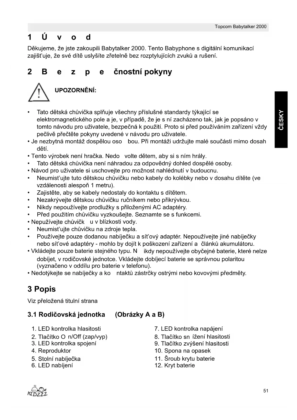 Záruka se nevztahuje na škody nebo závady způsobené nesprávným zacházením nebo používáním a na škody, které budou výsledkem používání neoriginálních dílů nedoporučených firmou Topcom. Bezdrátové telefony Topcom jsou určeny pro provoz pouze s dobíjecími bateriemi. Poškození způsobená používáním baterií, které nelze dobíjet, nejsou zárukou kryta. Záruka se nevztahuje na škody způsobené vnějšími faktory, jako je například osvětlení, voda a požár, ani na jakékoliv škody způsobené během přepravy. Žádnou záruku nelze uplatňovat tehdy, pokud dojde ke změně výrobního čísla na přístroji, jeho odstranění nebo pokud toto číslo bude nečitelné. Veškeré záruční nároky budou neplatné, pokud byla jednotka opravena, změněna nebo upravena kupcem nebo v nekvalifikovaném, oficiálně neautorizovaném servisním středisku společnosti Topcom.58 Topcom Babytalker 2000 Topcom Babytalker 2000 1Úvod Ďakujeme vám za zakúpenie prístroja Babytalker 2000. Tento babyfón s digitálnou komunikáciou zabezpečuje, že môžete svoje diet’a počut’ jasne bez akéhokoľvek rozptyľovania hlukom alebo interferenciou. 2Bezpečnostné pokyny UPOZORNENIE: