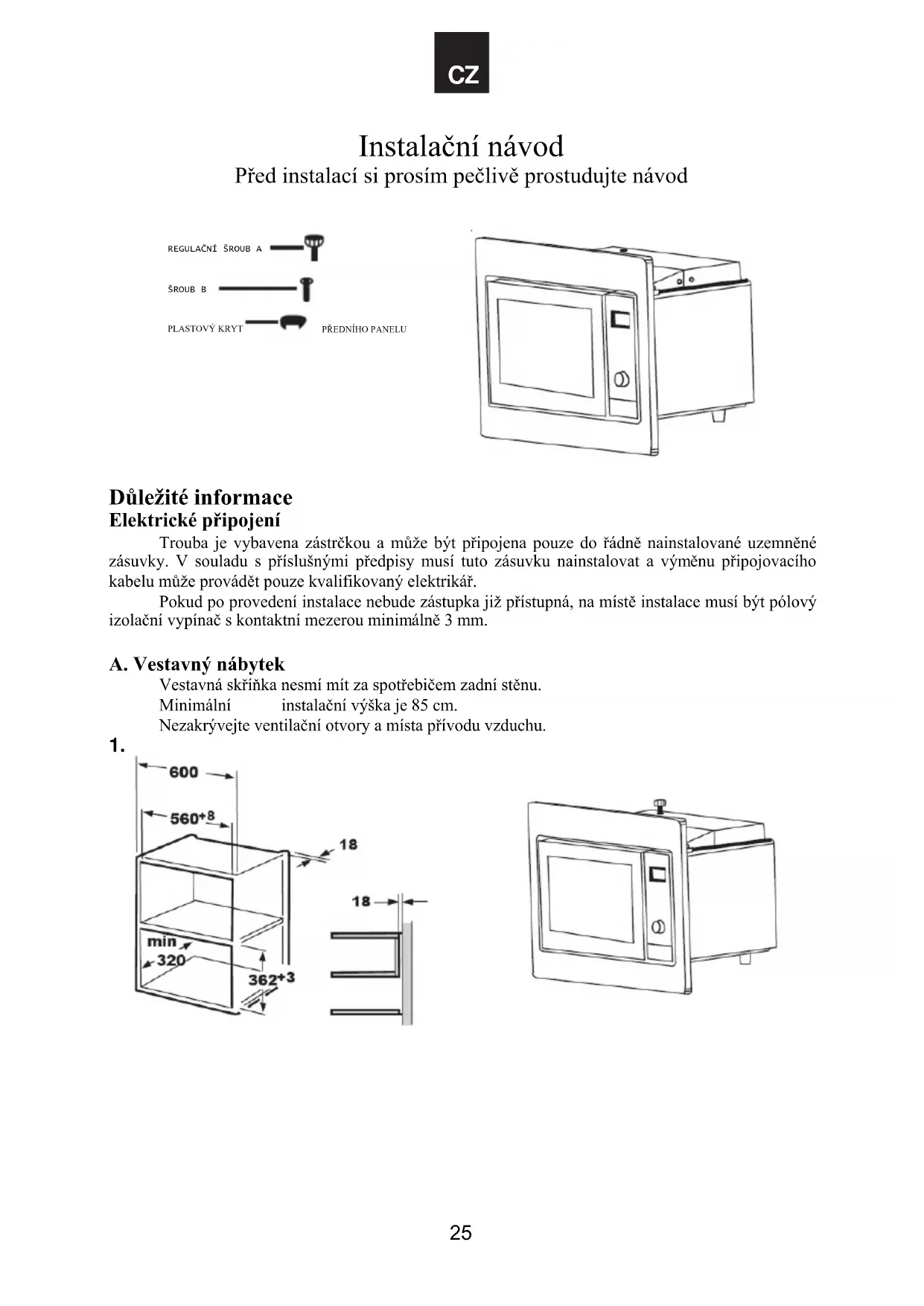 Důležité informace Elektrické připojení Trouba je vybavena zástrčkou a může být připojena pouze do řádně nainstalované uzemněné zásuvky. V souladu s příslušnými předpisy musí tuto zásuvku nainstalovat a výměnu připojovacího kabelu může provádět pouze kvalifikovaný elektrikář. Pokud po provedení instalace nebude zástupka již přístupná, na místě instalace musí být pólový izolační vypínač s kontaktní mezerou minimálně 3 mm. A. Vestavný nábytek Vestavná skříňka nesmí mít za spotřebičem zadní stěnu. Minimální instalační výška je 85 cm. Nezakrývejte ventilační otvory a místa přívodu vzduchu.