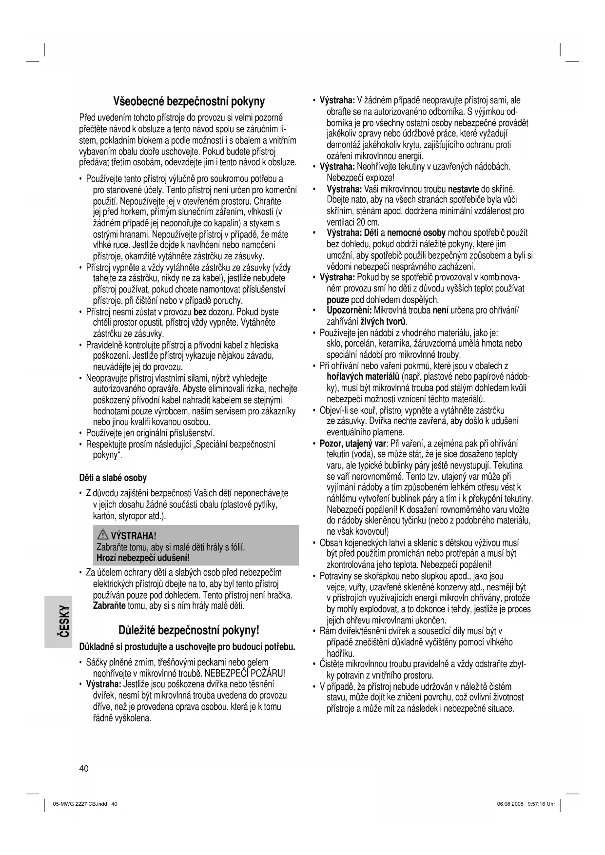 - Pro výměnu osvětlení trouby se prosím obraťte na odborný servis v blízkosti Vašeho bydliště. 05-MWG 2227 CB.indd 4205-MWG 2227 CB.indd 42 06.08.2008 9:57:17 Uhr06.08.2008 9:57:17 Uhr43 ČESKY ČESKY Technické údaje Model: .................................................................... MWG 2227 CB Pokrytí napětí: ...........................................................230 V, 50 Hz Příkon: mikrovlné trouby: ........................................................ 1050 W grilu: ............................................................................ 1000 W Stanovení rozměrů – výchozí výkon mikrovlné trouby: ................. 700 W/2450 MHz Objem varného prostoru: ......................................................17 litr Třída ochrany: .............................................................................. Ι Čistá hmotnost: ................................................................10,80 kg Tento přístroj byl testován podle všech příslušných, v současné době platných směrnic CE, jako je např. elektromagnetická kompatibilita a direktiva o nízkonapěťové bezpečnosti, a byl zkonstruován podle nejnovějších bezpečnostně-technických předpisů. Vyhrazujeme si technické změny! Význam symbolu „Popelnice“ Chraňte naše životní prostředí, elektropřístroje nepatří do domovního odpadu. Pro likvidaci elektropřístrojů použijte určených sběrných míst a odevzdejte zde elektropřístroje, jestliže je už nebudete používat. Pomůžete tak předejít možným negativním dopadům na životní prostředí a lidské zdraví, ke kterým by mohlo dojít v důsledku nesprávné likvidace. Přispějete tím ke zhodnocení, recyklaci a dalším formám zhod- nocení starých elektronických a elektrických přístrojů. Informace o tom, kde lze tyto přístroje odevzdat k likvidaci, obdržíte prostřednictvím územně správních celků nebo obecního úřadu. 05-MWG 2227 CB.indd 4305-MWG 2227 CB.indd 43 06.08.2008 9:57:18 Uhr06.08.2008 9:57:18 Uhr44 MAGYARUL MAGYARUL Általános biztonsági rendszabályok A készülék használatba vétele előtt gondosan olvassa végig a használati utasítást, és őrizze meg a garancialevéllel, a pénztári nyugtával és lehetőleg a csomagolókartonnal, ill. az abban lévő bélésanyaggal együtt! Amennyiben a készüléket harmadik személynek adja tovább, a használati útmutatót is adja a készülékhez.