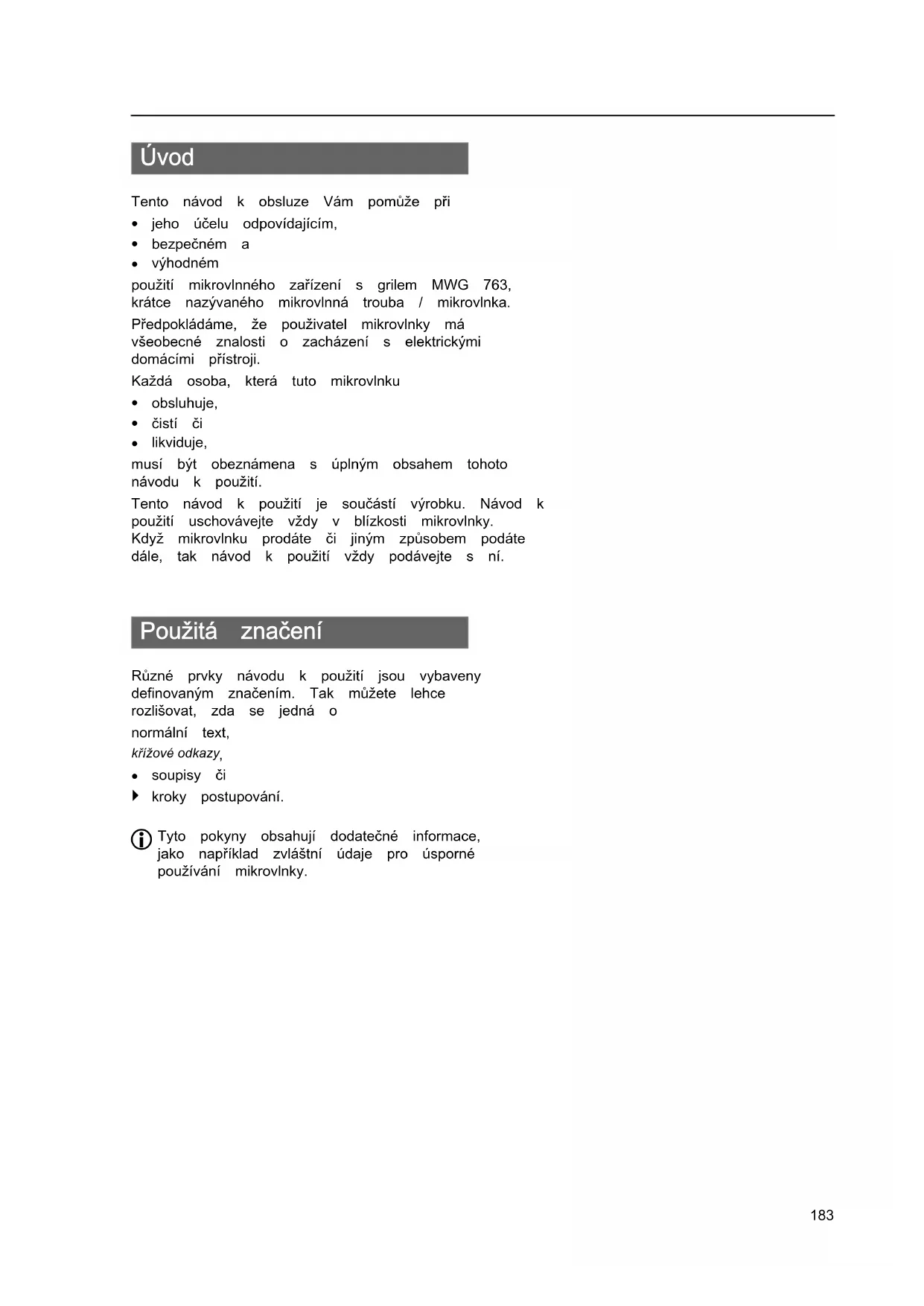 výhodném použití mikrovlnného zařízení s grilem MWG 763, krátce nazývaného mikrovlnná trouba / mikrovlnka. Předpokládáme, že použivatel mikrovlnky má všeobecné znalosti o zacházení s elektrickými domácími přístroji. Každá osoba, která tuto mikrovlnku