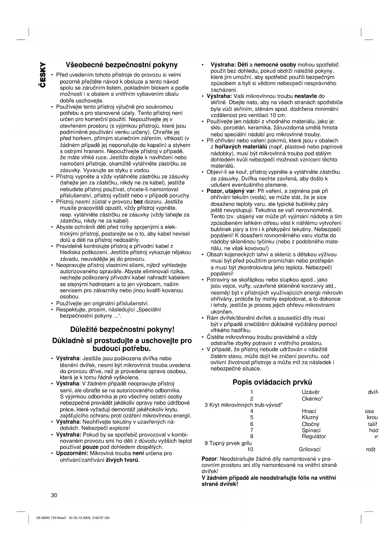 - V případě, že přístroj nebude udržován v náležitě čistém stavu, může dojít ke zničení povrchu, což ovlivní životnost přístroje a může mít za následek i nebezpečné situace. Popis ovládacích prvků 1 Uzávěr dvířek 2 Okénko* 3 Kryt mikrovlnných trub-vývod* 4 Hnací osa 5 Kluzný kroužek 6 Otočný talíř 7 Spínací hodiny 8 Regulátor výkonu 9 Topný prvek grilu 10 Grilovací rošt Pozor: Neodstraňujte žádné díly namontované v pra- covním prostoru ani díly namontované na vnitřní straně dvířek! V žádném případě ale neodstraňujte fólie na vnitřní straně dvířek! 05-MWG 733 New2 30 20.12.2005, 9:52:07 Uhr31