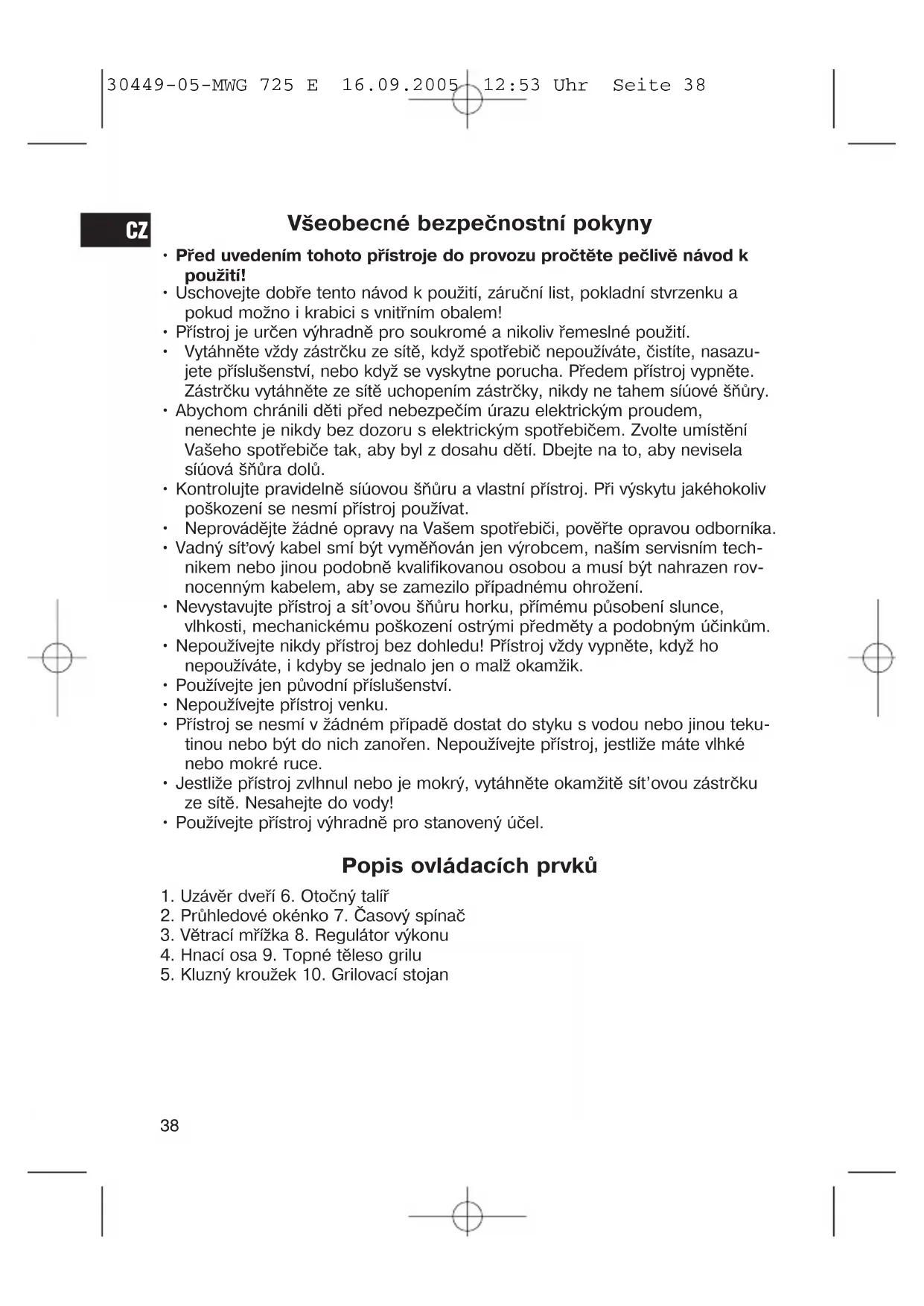 30449-05-MWG 725 E 16.09.2005 12:53 Uhr Seite 38Zvláštní bezpečnostní pokyny pro tento přístroj