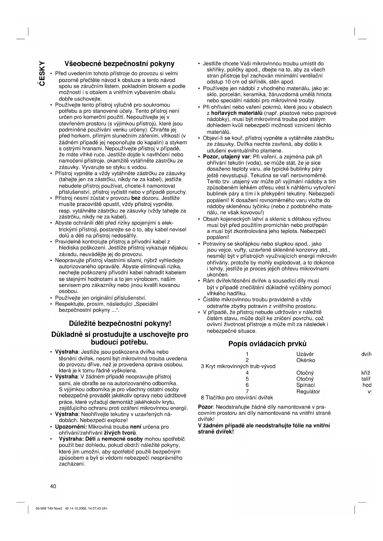 - V případě, že přístroj nebude udržován v náležitě čistém stavu, může dojít ke zničení povrchu, což ovlivní životnost přístroje a může mít za následek i nebezpečné situace. Popis ovládacích prvků 1 Uzávěr dvířek 2 Okénko 3 Kryt mikrovlnných trub-vývod 4 Otočný kříž 5 Otočný talíř 6 Spínací hodiny 7 Regulátor výkonu 8 Tlačítko pro otevírání dvířek Pozor: Neodstraňujte žádné díly namontované v pra- covním prostoru ani díly namontované na vnitřní straně dvířek! V žádném případě ale neodstraňujte fólie na vnitřní straně dvířek! 05-MW 749 New2 40 14.10.2005, 14:07:43 Uhr41