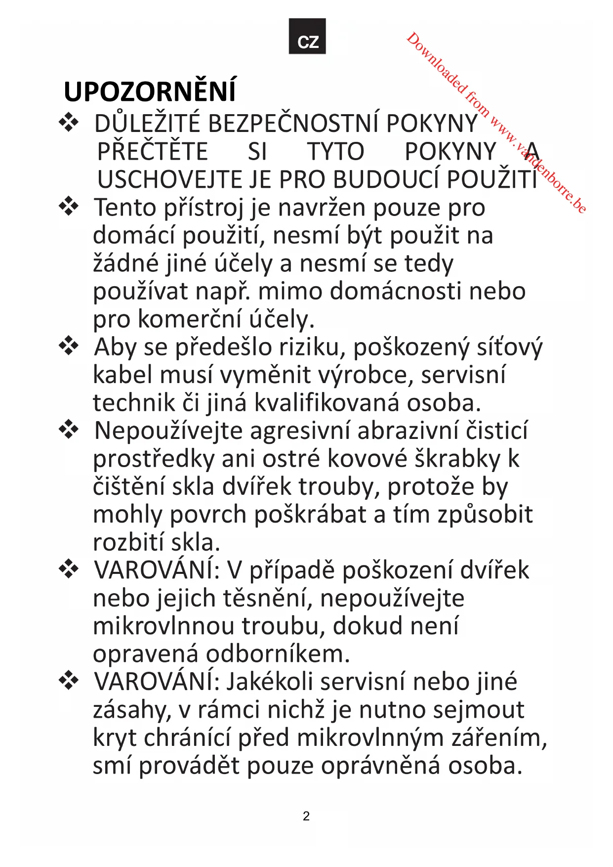 Downloaded from www.vandenborre.beINSTALACE MIKROVLNNÉ TROUBY Odstraňtevšechnybalícímateriálya příslušenství.Zkontrolujte,zdanení troubapoškozená,prohnutánebozda nejsoupoškozenádvířka.Nepoužívejte troubu,pokudjepoškozená.