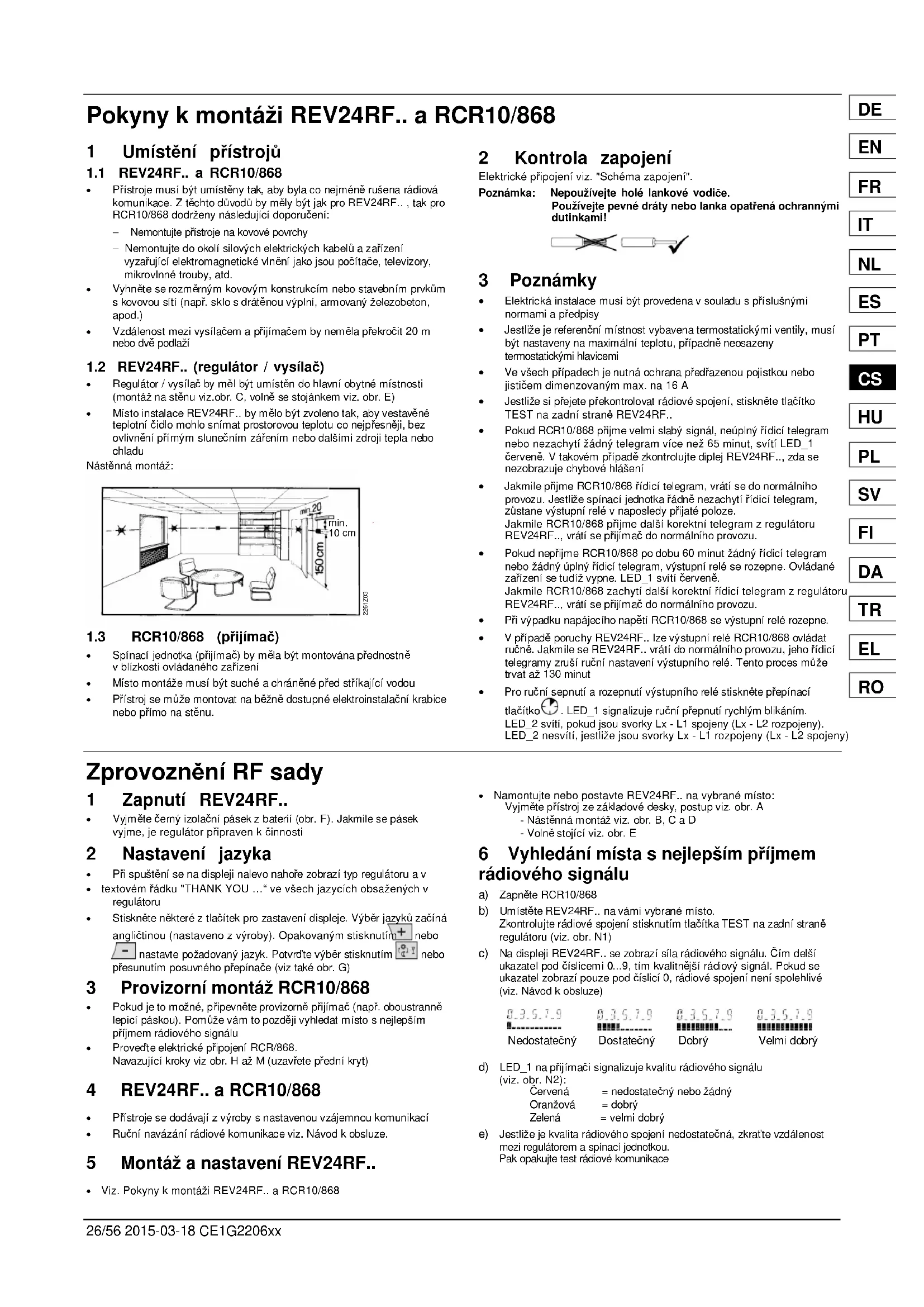 - Viz. Pokyny k montáži REV24RF.. a RCR10/868· Namontujte nebo postavte REV24RF.. na vybrané místo: Vyjměte přístroj ze základové desky, postup viz. obr. A - Nástěnná montáž viz. obr. B, C a D - Volně stojící viz. obr. E 6 Vyhledání místa s nejlepším příjmem rádiového signálu a) Zapněte RCR10/868 b) Umístěte REV24RF.. na vámi vybrané místo. Zkontrolujte rádiové spojení stisknutím tlačítka TEST na zadní straně regulátoru (viz. obr. N1) c) Na displeji REV24RF.. se zobrazí síla rádiového signálu. Čím delší ukazatel pod číslicemi 0...9, tím kvalitnější rádiový signál. Pokud se ukazatel zobrazí pouze pod číslicí 0, rádiové spojení není spolehlivé (viz. Návod k obsluze) Nedostatečný Dostatečný Dobrý Velmi dobrý d) LED_1 na přijímači signalizuje kvalitu rádiového signálu (viz. obr. N2): Červená = nedostatečný nebo žádný Oranžová = dobrý Zelená = velmi dobrý e) Jestliže je kvalita rádiového spojení nedostatečná, zkraťte vzdálenost mezi regulátorem a spínací jednotkou. Pak opakujte test rádiové komunikace
