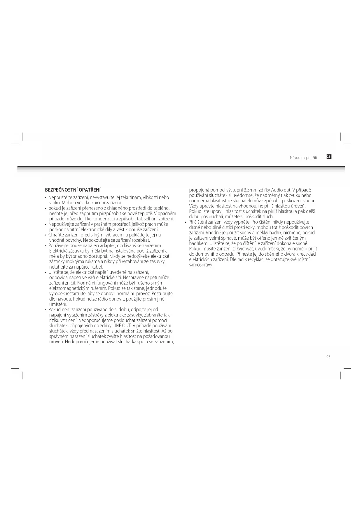 - Pokud není zařízení používáno delší dobu, odpojte jej od napájení vytažením zástrčky z elektrické zásuvky. Zabráníte tak riziku vznícení. Nedoporučujeme poslouchat zařízení pomocí sluchátek, připojených do zdířky LINE OUT. V případě používání sluchátek, vždy před nasazením sluchátek snižte hlasitost. Až po správném nasazení sluchátek zvyšte hlasitost na požadovanou úroveň. Nedoporučujeme používat sluchátka spolu se zařízením, propojená pomocí výstupní 3,5mm zdířky Audio out. V případě používání sluchátek si uvědomte, že nadměrný tlak zvuku nebo nadměrná hlasitost ze sluchátek může způsobit poškození sluchu. Vždy upravte hlasitost na vhodnou, ne příliš hlasitou úroveň. Pokud jste upravili hlasitost sluchátek na příliš hlasitou a pak delší dobu poslouchali, můžete si poškodit sluch.