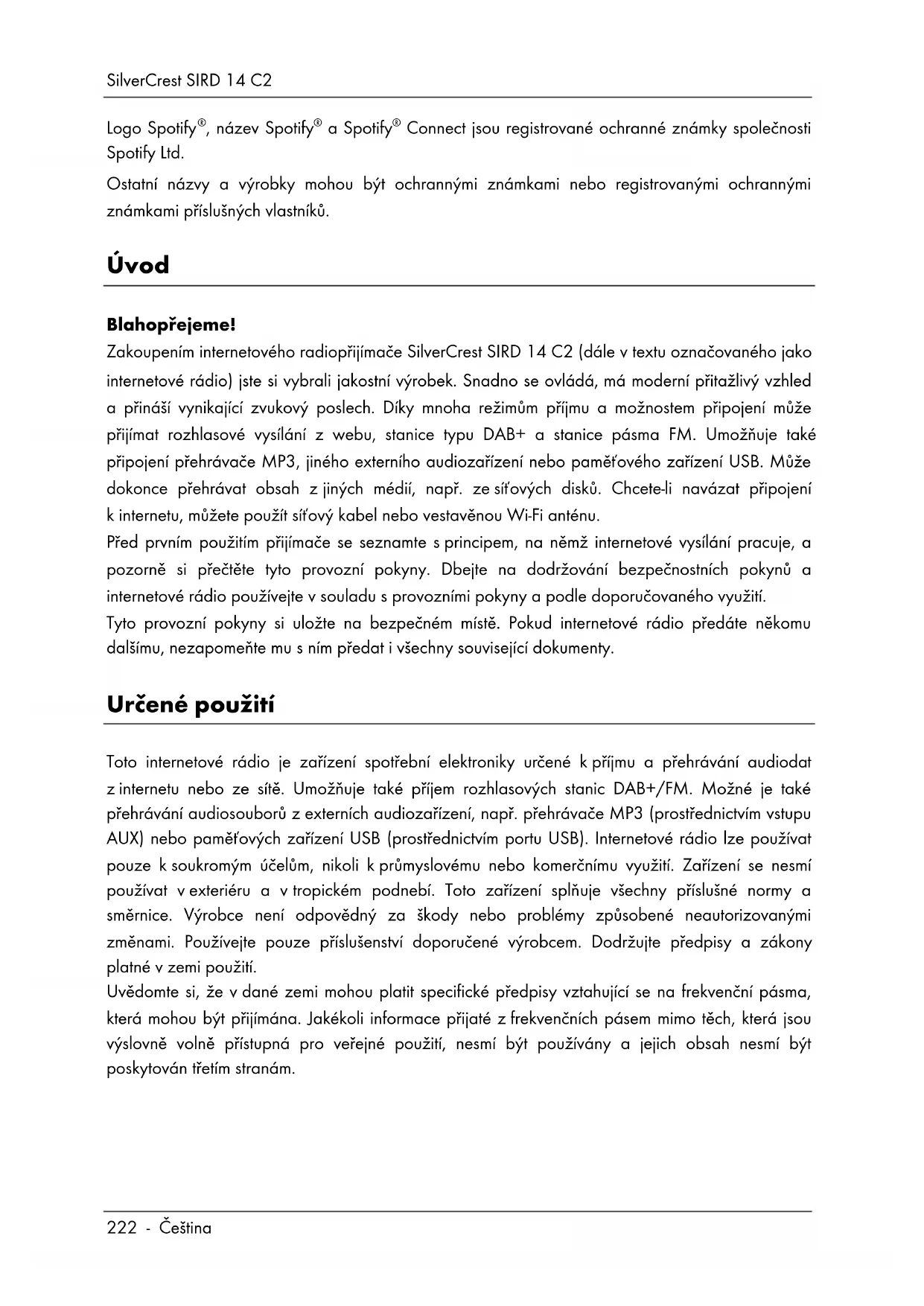 Connect jsou registrované ochranné známky společnosti Spotify Ltd. Ostatní názvy a výrobky mohou být ochrannými známkami nebo registrovanými ochrannými známkami příslušných vlastníků. Úvod Blahopřejeme! Zakoupením internetového radiopřijímače SilverCrest SIRD 14 C2 (dále v textu označovaného jako internetové rádio) jste si vybrali jakostní výrobek. Snadno se ovládá, má moderní přitažlivý vzhled a přináší vynikající zvukový poslech. Díky mnoha režimům příjmu a možnostem připojení může přijímat rozhlasové vysílání z webu, stanice typu DAB+ a stanice pásma FM. Umožňuje také připojení přehrávače MP3, jiného externího audiozařízení nebo paměťového zařízení USB. Může dokonce přehrávat obsah z jiných médií, např. ze síťových disků. Chcete-li navázat připojení k internetu, můžete použít síťový kabel nebo vestavěnou Wi-Fi anténu. Před prvním použitím přijímače se seznamte s principem, na němž internetové vysílání pracuje, a pozorně si přečtěte tyto provozní pokyny. Dbejte na dodržování bezpečnostních pokynů a internetové rádio používejte v souladu s provozními pokyny a podle doporučovaného využití. Tyto provozní pokyny si uložte na bezpečném místě. Pokud internetové rádio předáte někomu dalšímu, nezapomeňte mu s ním předat i všechny související dokumenty. Určené použití Toto internetové rádio je zařízení spotřební elektroniky určené k příjmu a přehrávání audiodat z internetu nebo ze sítě. Umožňuje také příjem rozhlasových stanic DAB+/FM. Možné je také přehrávání audiosouborů z externích audiozařízení, např. přehrávače MP3 (prostřednictvím vstupu AUX) nebo paměťových zařízení USB (prostřednictvím portu USB). Internetové rádio lze používat pouze k soukromým účelům, nikoli k průmyslovému nebo komerčnímu využití. Zařízení se nesmí používat v exteriéru a v tropickém podnebí. Toto zařízení splňuje všechny příslušné normy a směrnice. Výrobce není odpovědný za škody nebo problémy způsobené neautorizovanými změnami. Používejte pouze příslušenství doporučené výrobcem. Dodržujte předpisy a zákony platné v zemi použití. Uvědomte si, že v dané zemi mohou platit specifické předpisy vztahující se na frekvenční pásma, která mohou být přijímána. Jakékoli informace přijaté z frekvenčních pásem mimo těch, která jsou výslovně volně přístupná pro veřejné použití, nesmí být používány a jejich obsah nesmí být poskytován třetím stranám.SilverCrest SIRD 14 C2 Čeština - 223 Obsah balení Přístroj a veškeré příslušenství vyndejte z obalu. Odstraňte obalový materiál a zkontrolujte, zda jsou všechny součástí kompletní a nepoškozené. Pokud zjistíte jakoukoli chybějící nebo poškozenou položku, kontaktujte výrobce.