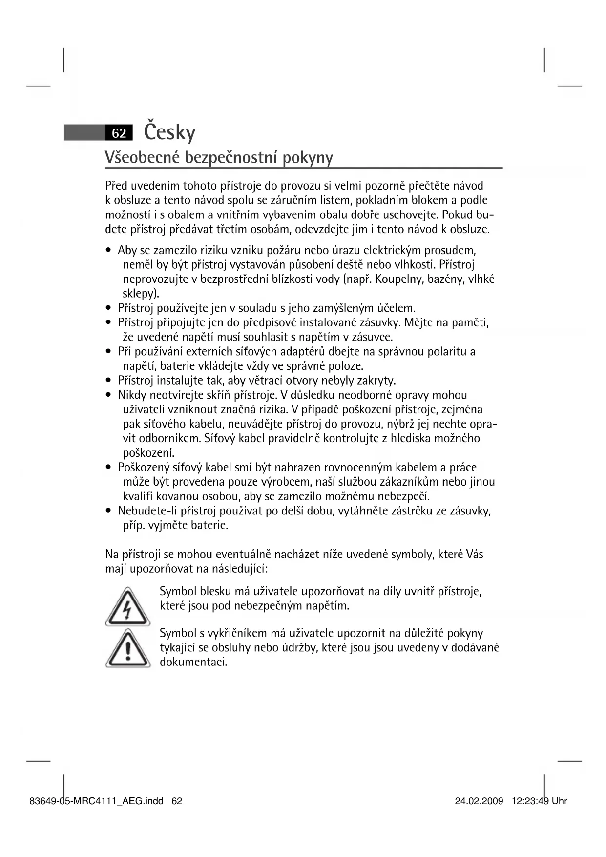 - Nebudete-li přístroj používat po delší dobu, vytáhněte zástrčku ze zásuvky, příp. vyjměte baterie. Na přístroji se mohou eventuálně nacházet níže uvedené symboly, které Vás mají upozorňovat na následující: Symbol blesku má uživatele upozorňovat na díly uvnitř přístroje, které jsou pod nebezpečným napětím. Symbol s vykřičníkem má uživatele upozornit na důležité pokyny týkající se obsluhy nebo údržby, které jsou jsou uvedeny v dodávané dokumentaci. 83649-05-MRC4111_AEG.indd 6283649-05-MRC4111_AEG.indd 62 24.02.2009 12:23:49 Uhr24.02.2009 12:23:49 UhrČesky