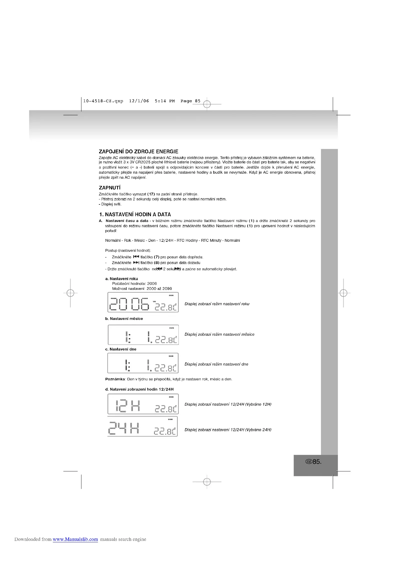 10-4518-CZ.qxp 12/1/06 5:14 PM Page 85 Downloaded from www.Manualslib.com manuals search enginee. Nastavení RTC hodinDisplej zobrazí režim nastavení hodinf. Nastavení RTC minutDisplej zobrazí režim nastavení minutPoznámka: sekundy se při každém nastavení minut vymažou. B. Nastavení Budíku 1 a Budíku 2 - v běžném režimu zmáčkněte tlačítko Nastavení budíku (2) a držte zmáčknuté 2 sekundy pro vstoupení do režimu nastavení budíku, potom zmáčkněte tlačítko Nastavení budíku (2) pro upravení hodnot v následujícím pořadí:Normální - AL1 Hodiny - AL1 Minuty - AL1 budík na víkend - AL2 Hodiny - AL2 Minuty - AL2 budík na víkend - NormálníPostup (nastavení hodnot): - Zmáčkněte tlačítko (7) pro posun data dopředu. - Zmáčkněte tlačítko (8) pro posun data dozadu. - Držte zmáčknuté tlačítko nebo 2 sekundy a začne se automaticky převíjet.Displej zobrazí nastavení hodin Budíku 1Displej zobrazí nastavení minut Budíku 1Displej zobrazí nastavení budíku na víkend Budík 1 – Po až PáDisplej zobrazí nastavení budíku na víkend Budík 1 – Po až NeDisplej zobrazí nastavení budíku na víkend Budík 1 – Po až SoDisplej zobrazí nastavení hodin Budíku 2Displej zobrazí nastavení minut Budíku 2Displej zobrazí nastavení budíku na víkend Budík 2 – Po až Pá