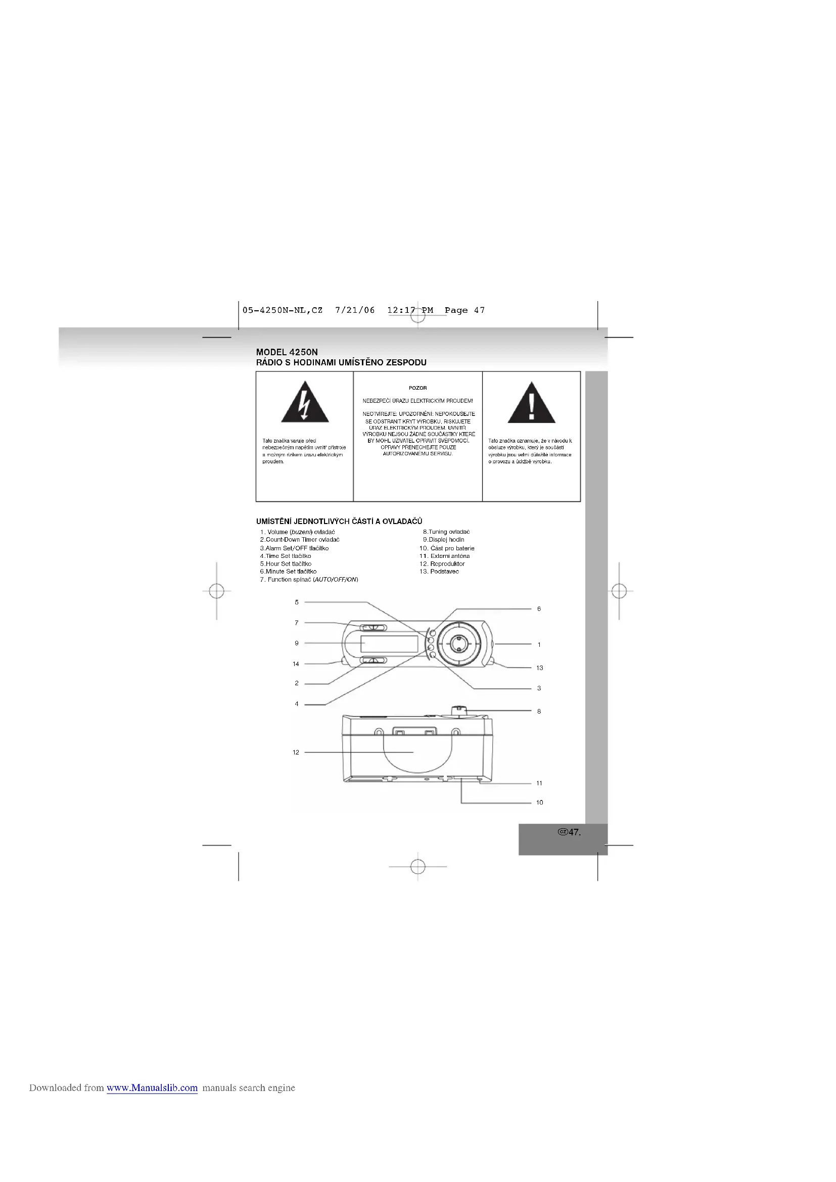 05-4250N-NL,CZ 7/21/06 12:17 PM Page 46 Downloaded from www.Manualslib.com manuals search engineUMÍSTĚNÍ JEDNOTLIVÝCH ČÁSTÍ A OVLADAČŮ1. Volume (buzení) ovladač2.Count-Down Timer ovladač3.Alarm Set/OFF tlačítko4.Time Set tlačítko5.Hour Set tlačítko6.Minute Set tlačítko7. Function spínač (AUTO/OFF/ON) Tato značka varuje přednebezpečným napětím uvnitř přístrojea možným rizikem úrazu elektrickýmproudem.POZORNEBEZPEČÍ ÚRAZU ELEKTRICKÝM PROUDEM!NEOTVÍREJTE: UPOZORNĚNÍ: NEPOKOUŠEJTESE ODSTRANIT KRYT VÝROBKU, RISKUJETEÚRAZ ELEKTRICKÝM PROUDEM. UVNITŘVÝROBKU NEJSOU ŽÁDNÉ SOUČÁSTKY KTERÉBY MOHL UŽIVATEL OPRAVIT SVÉPOMOCÍ.OPRAVY PŘENECHEJTE POUZEAUTORIZOVANÉMU SERVISU.Tato značka oznamuje, že v návodu kobsluze výrobku, který je součástívýrobku jsou velmi důležité informaceo provozu a údržbě výrobku.8.Tuning ovladač9.Displej hodin10. Část pro baterie11. Externí anténa12. Reproduktor13. Podstavec