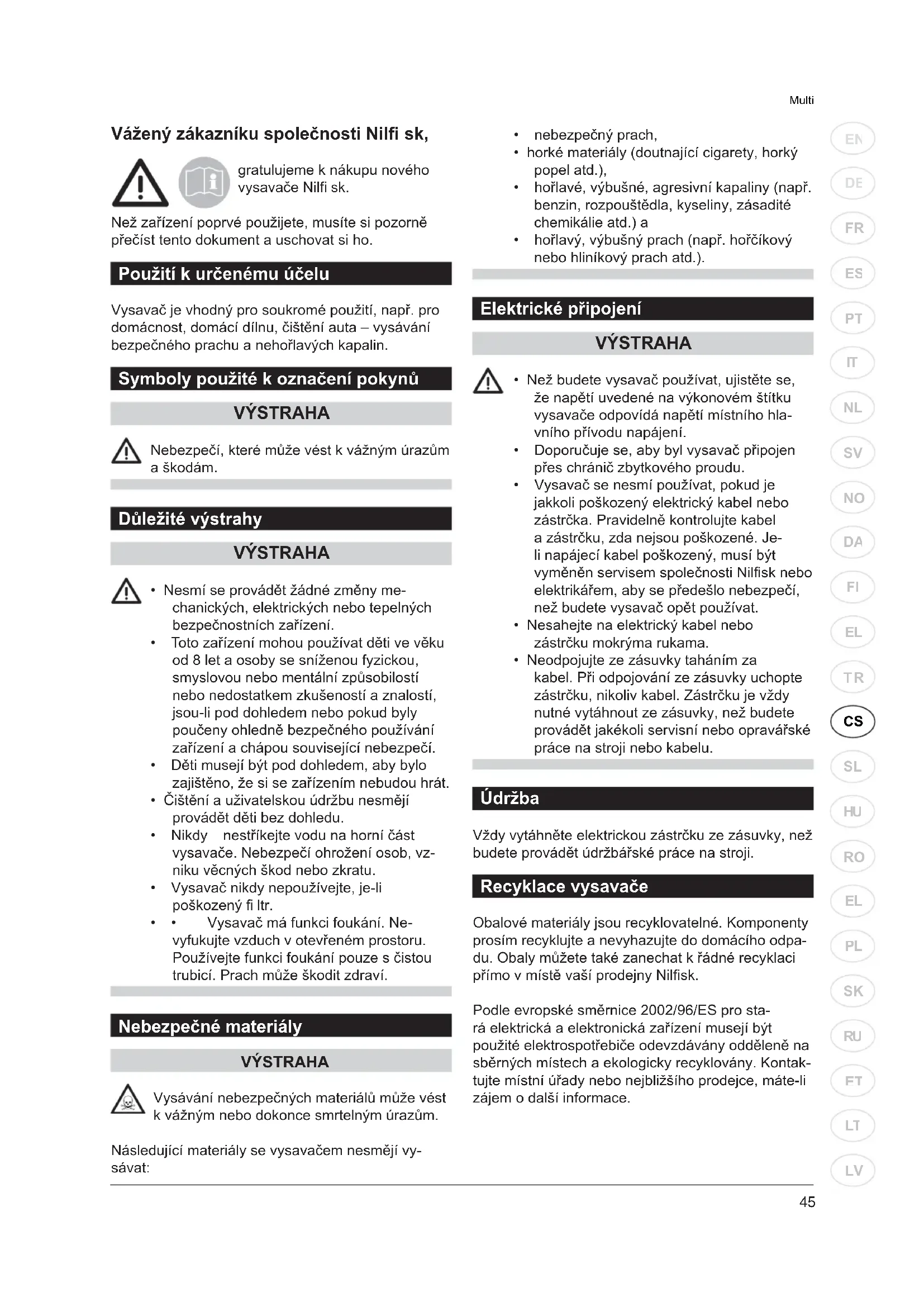 - Neodpojujte ze zásuvky taháním za kabel. Při odpojování ze zásuvky uchopte zástrčku, nikoliv kabel. Zástrčku je vždy nutné vytáhnout ze zásuvky, než budete provádět jakékoli servisní nebo opravářské práce na stroji nebo kabelu. Údržba Vždy vytáhněte elektrickou zástrčku ze zásuvky, než budete provádět údržbářské práce na stroji. Recyklace vysavače Obalové materiály jsou recyklovatelné. Komponenty prosím recyklujte a nevyhazujte do domácího odpa- du. Obaly můžete také zanechat k řádné recyklaci přímo v místě vaší prodejny Nilfi sk. Podle evropské směrnice 2002/96/ES pro sta- rá elektrická a elektronická zařízení musejí být použité elektrospotřebiče odevzdávány odděleně na sběrných místech a ekologicky recyklovány. Kontak- tujte místní úřady nebo nejbližšího prodejce, máte-li zájem o další informace.46 Multi