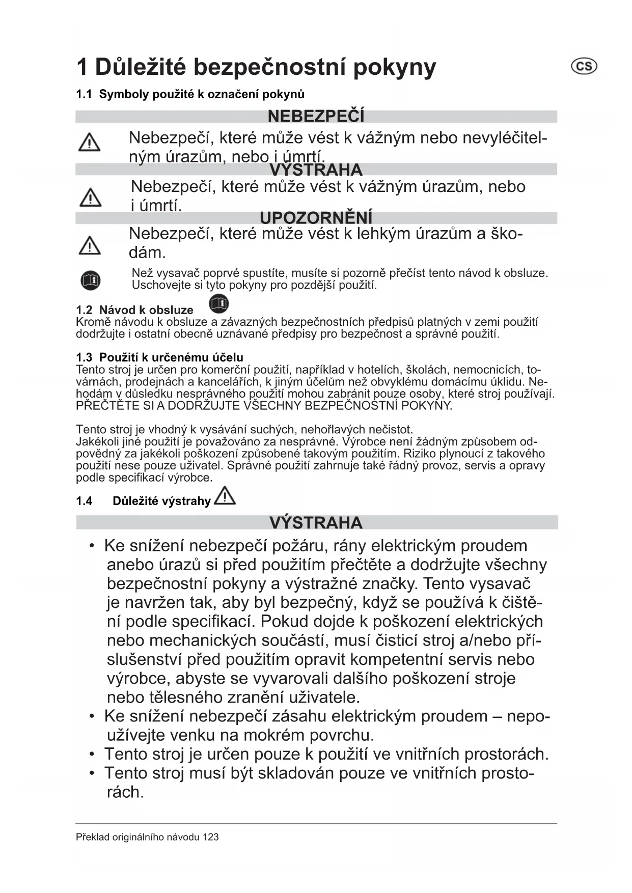 - Ke snížení nebezpečí požáru, rány elektrickým proudem anebo úrazů si před použitím přečtěte a dodržujte všechny bezpečnostní pokyny a výstražné značky. Tento vysavač je navržen tak, aby byl bezpečný, když se používá k čiště- ní podle specifikací. Pokud dojde k poškození elektrických nebo mechanických součástí, musí čisticí stroj a/nebo pří- slušenství před použitím opravit kompetentní servis nebo výrobce, abyste se vyvarovali dalšího poškození stroje nebo tělesného zranění uživatele.