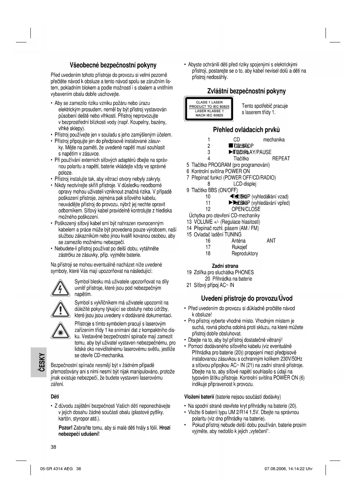 - Pokud přístroj nebude delší dobu používán, baterie prosím vyjměte, aby nedošlo k jejich „vytečení“. 05-SR 4314 AEG 38 07.08.2006, 14:14:22 UhrČESKY