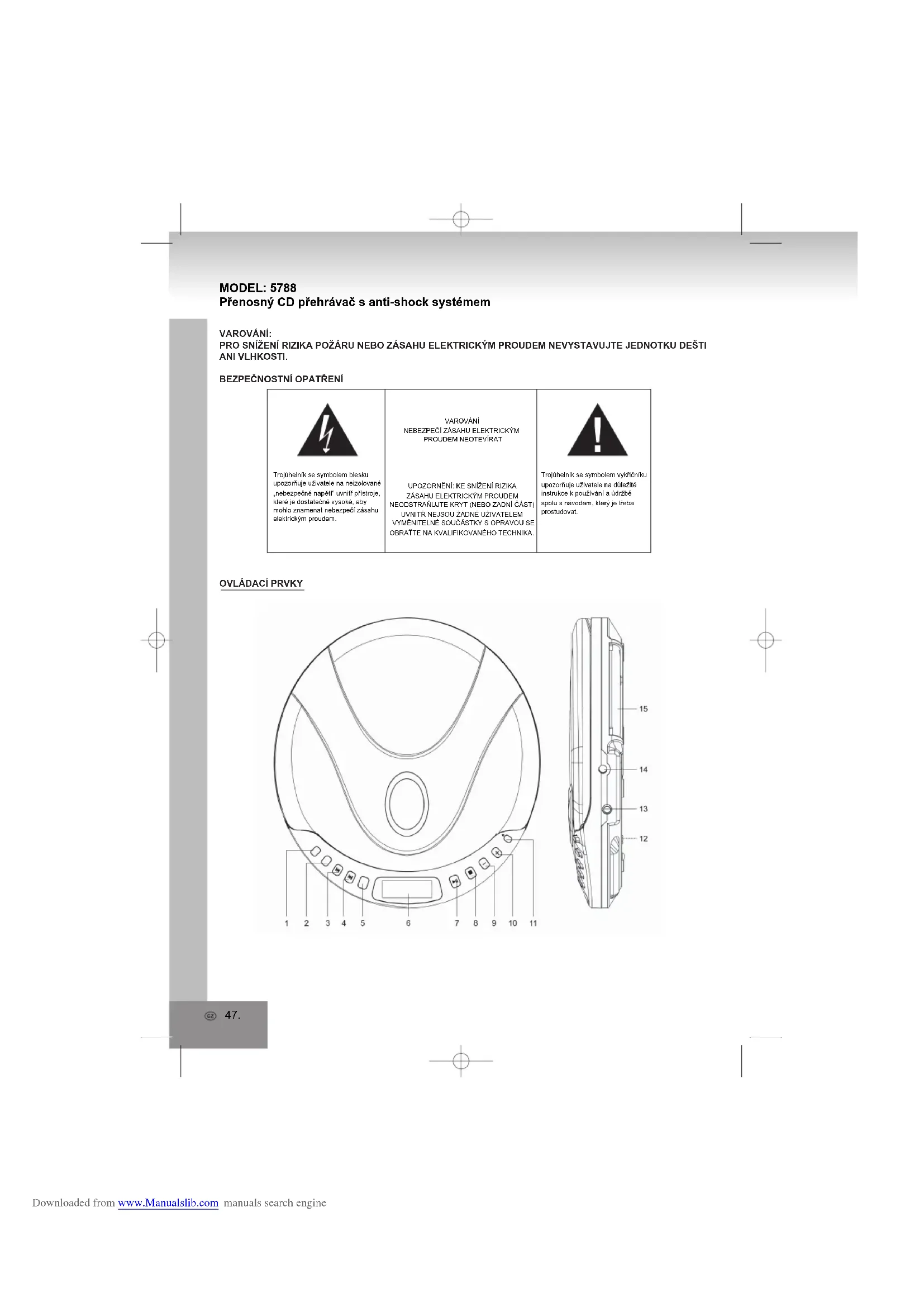 Nepokoušejte se opravit svůj výrobek sami, otevřením a sejmutím krytů se můžete vystavit nebezpečnému napětí a dalším rizikům. S jakýmikoli opravami se obraťte na kvalifikovaného odborníka. Dbejte na to, aby si děti nevložili malé součástky do úst a nespolknuli je. Zvláštní pozornost věnujte obalovým materiálům. OCHRANA SLUCHU Vážíme se si vašeho zdraví. Ujistěte se, prosím, že hlasitost je nastavena tak, aby nemohla způsobit poruchu sluchu. Vyhněte se vysoké hlasitosti. Ujistěte se také, že i vaše děti nastavují rozumnou hladinu hlasitosti. Nikdy do otvorů na rádiu nevtlačujte dovnitř žádné typy předmětů, protože by mohly pžijít přijít do styku s body vysokého napětí nebo zkratovat části, což by mohlo vyústit v požát požár nebo elektrický zkrat. Na výrobek nikdy nenalévejte žádné tekutiny. Používejte pouze k určenému účelu. Před použitím přehrávače si přečtěte všechny bezpečnostní a provozní instrukce. Recyklace materiálů pomáhá zachovat přírodní zdroje. Tento symbol na výrobku nebo na jeho balení označuje, že nesmí být likvidován jako běžný domovní odpad. Namísto toho, je třeba jej zlikvidovat ve sběrných místech určených pro recyklaci elektrického a elektronického odpadu. Správným nakládáním s tímto výrobkem zajistíte, aby jeho likvidace neměla žádný negativní dopad na životní prostředí či lidské zdraví, což by jinak mohlo vyhození tohoto výrobku do odpadkového koše způsobit; ujistěte se, prosím, že se řádně recyklován odděleně v souladu s vašíimi lokálními právními předpisy. Horko Nevystavujte přehrávač přímému slunci ani zdrojům tepla jako jsou topidla či otevřený oheň. Ujistěte se, prosím, že ventilační otvory nejsou blokovány. Přehrávač není voděodolný. Nesmí přijít do kontaktu s vodou. Čistěte pouze lehce navlhčeným hadříkem. Nepoužívejte čistící prostředky s obsahem alkoholu, amoniaku, benzínu či abraziv. Baterie zlikvidujte způsobem neohrožujícím životní prostředí Baterie nepatří do domovnímho odpadu. Namísto toho je třeba je vyhodit ve sběrných místech určených pro likvidaci použitých baterií. Baterie nikdy neházejte do ohně. Downloaded from www.Manualslib.com manuals search engine52. Üzerinde şimşek sembolü bulunan üçgen işaret kullanıcıyı "Tehlikeli Akım" konusunda uyararak cihaz üzerinde yalıtım olmadığı için bu akımın olası bir elektrik çarpmasına sebep olacağı hakkında da uyarır.UYARIELEKTRİK ÇARPABİLİRAÇMAYINIZDİKKAT: ELEKTRİK ÇARPMASININ ÖNÜNE GEÇMEK İÇİN, KAPAĞI AÇMAYINIZ (VEYA ARKA KISMI). KULLANICININ ONARACAĞI PARÇA BULUNMAMAKTADIR. UZMAN EKİPLERLE TEMASA GEÇEREK SORUNU GİDERİNİZ.Üzerinde ünlem işareti bulunan üçgen işaret kulanıcıyı kılavuzda yer alan ve dikkatle okunması ve takibedilmesi gereken kullanma ve onarım talimatları hakkında bilgilendirir. MODEL: 5788 Seyyar Şok Koruma Sistemli CD Çalar
